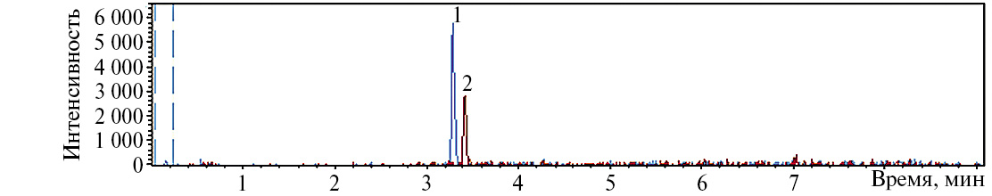 Рис. 2. Хроматограмма по выделенным ионам разбавленного образца мочи после употребления ибутаморена. m/z: 1 – 721.2749, 2 – 737.2698.