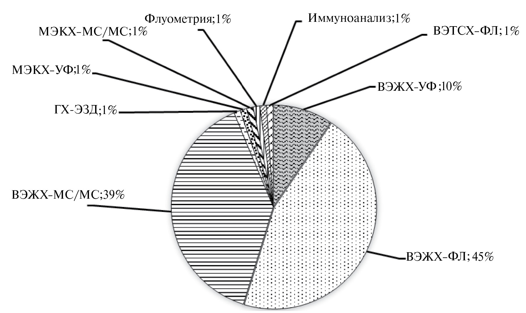 Рис. 1. Распределение количества публикаций, вышедших в свет в 2000—2023 гг., по применяемым методам анализа (ГХ-ЭЗД — газовая хроматография с электронно-захватным детектором; МЭКХ — мицеллярная электрокинетическая хроматография).