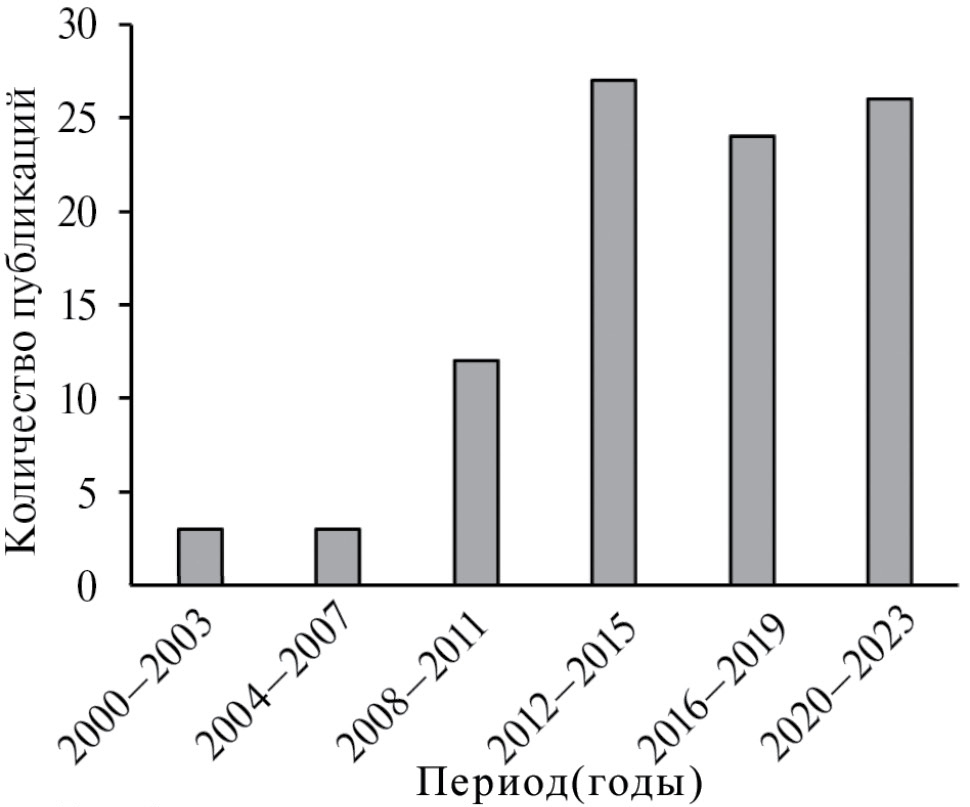 Рис. 2. Количество публикаций, посвященных микроэкстракционному выделению микотоксинов из пищевых продуктов, вышедших в свет, начиная с 2000 г. (на основании поиска литературных источников в Российской научной электронной библиотеке Elibrary и базе данных Scopus).