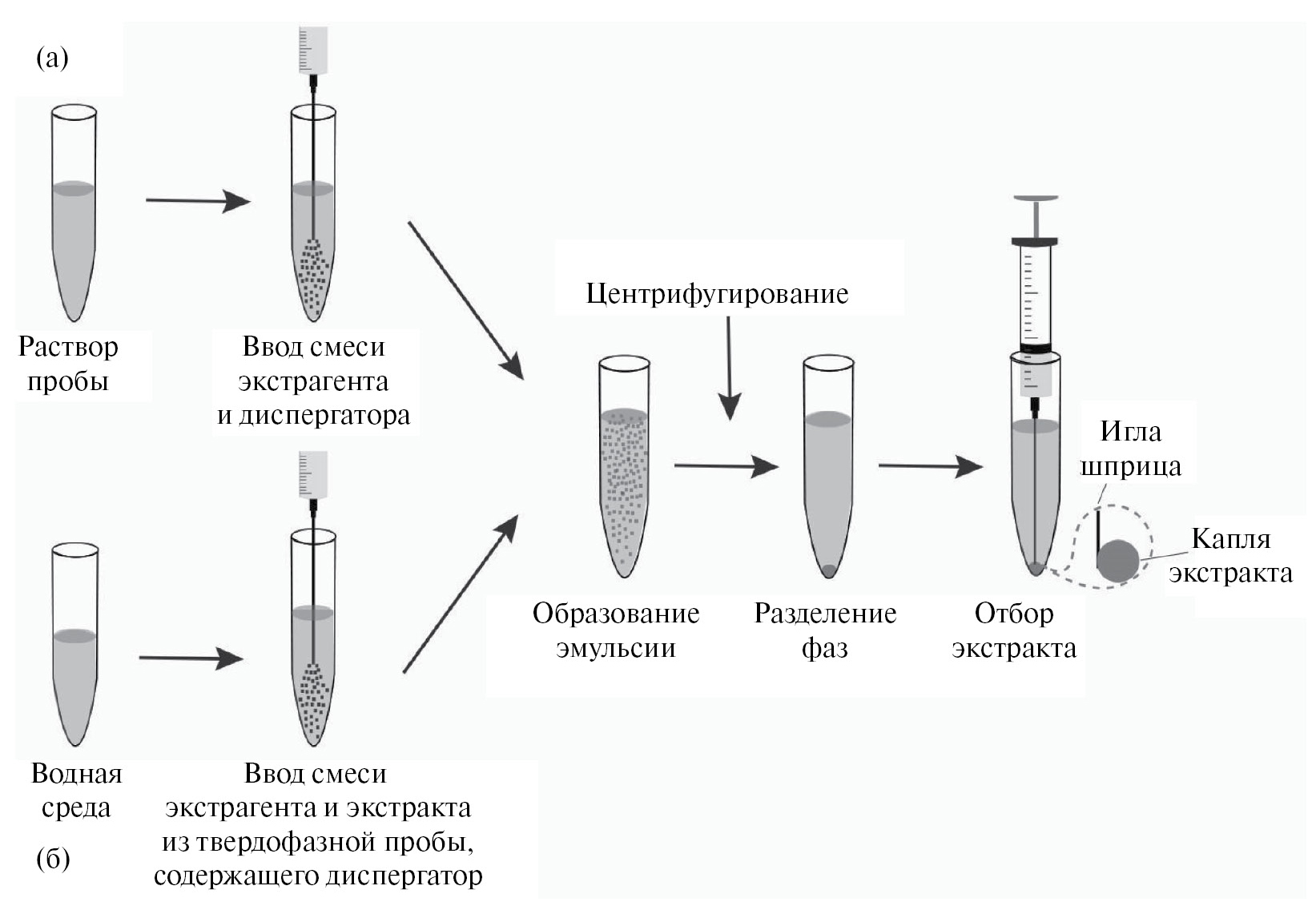 Рис. 4. Схема дисперсионной жидкостно-жидкостной микроэкстракции при концентрировании микотоксинов из водного раствора пробы (а) или экстракта из твердофазной пробы (б).