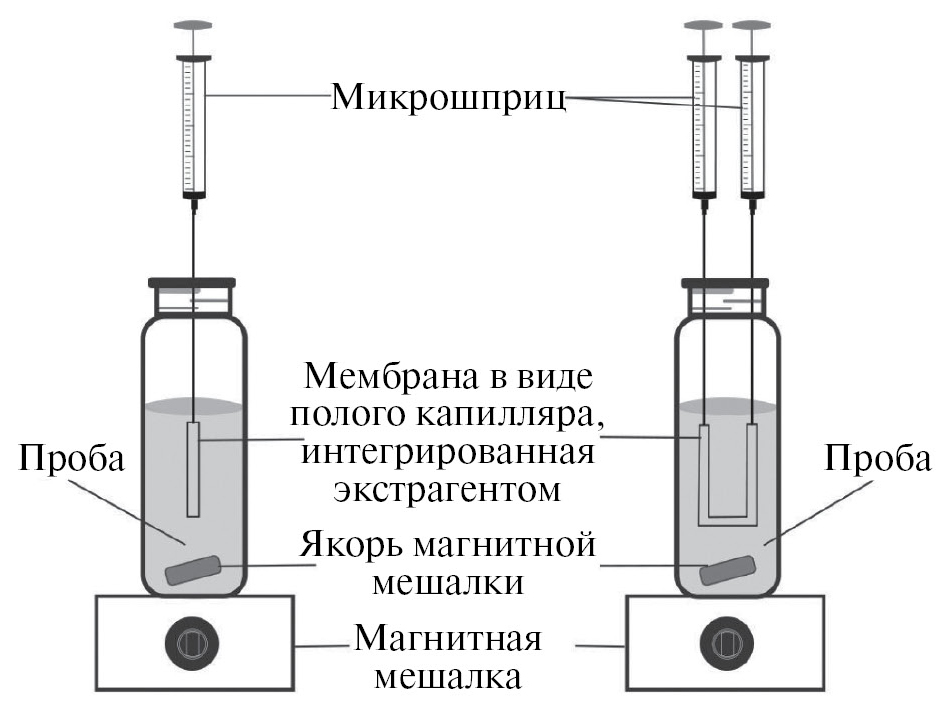 Для извлечения микотоксинов (афлатоксинов, охратоксина А и Т-2 токсина) из проб пищевых продуктов (пива и вина [77], риса, пшеницы, семян кунжута [19], смеси соевого молока и яблочного сока [41], яблочного, апельсинового, виноградного и гранатового соков [23], молока [78]) также используют МЖЖМЭ, которая предполагает извлечение целевых аналитов в фазу экстрагента, находящуюся в порах полимерной мембраны (рис. 5), чаще всего имеющей форму полого капилляра из полипропилена [28, 79]. Данный подход решает проблему стабильности фазы экстрагента по отношению к внешним воздействиям, присущую КМЭ, например, позволяет экстрагировать афлатоксины B1, B2, G1, G2 из смеси соевого молока и яблочного сока, которая представляет собой эмульсию [41]. Мембрану смачивают подходящим экстрагентом (н-октанолом [19, 23, 41, 77]), закрепляют на игле или металлическом стержне и погружают в пробу. При перемешивании происходит массоперенос аналитов в фазу экстрагента, которую далее смывают ацетонитрилом, метанолом или смесью ацетонитрила и воды для последующего анализа. Стоит отметить, что при использовании МЖЖМЭ для извлечения микотоксинов из образцов требуется значительное время (до 4 ч в случае выделения охратоксина А и Т-2 токсина из проб вина и пива в н-октанол [77]). Для достижения более высоких степеней извлечения и ускорения процесса массопереноса микотоксинов из проб предложено диспергировать наноматериалы (композитные частицы оксида графена и поливинилпирролидона) в экстрагенте [19] либо комбинировать МЖЖМЭ с ДЖЖМЭ [23, 41]. Первый подход позволяет одновременно извлекать аналиты по механизмам ЖЖМЭ и ТФМЭ. Второй предполагает введение смеси экстрагента (толуола) и диспергатора (ацетона) в водную фазу пробы, погружение мембраны, пропитанной н-октанолом, в образовавшуюся эмульсию. При этом происходит перенос микрокапель толуола, содержащих аналит, через мембрану. Возможна автоматизация МЖЖМЭ [78]. Для определения аналитов после МЖЖМЭ используют ВЭЖХ-ФЛ и ВЭЖХ—МС/МС.