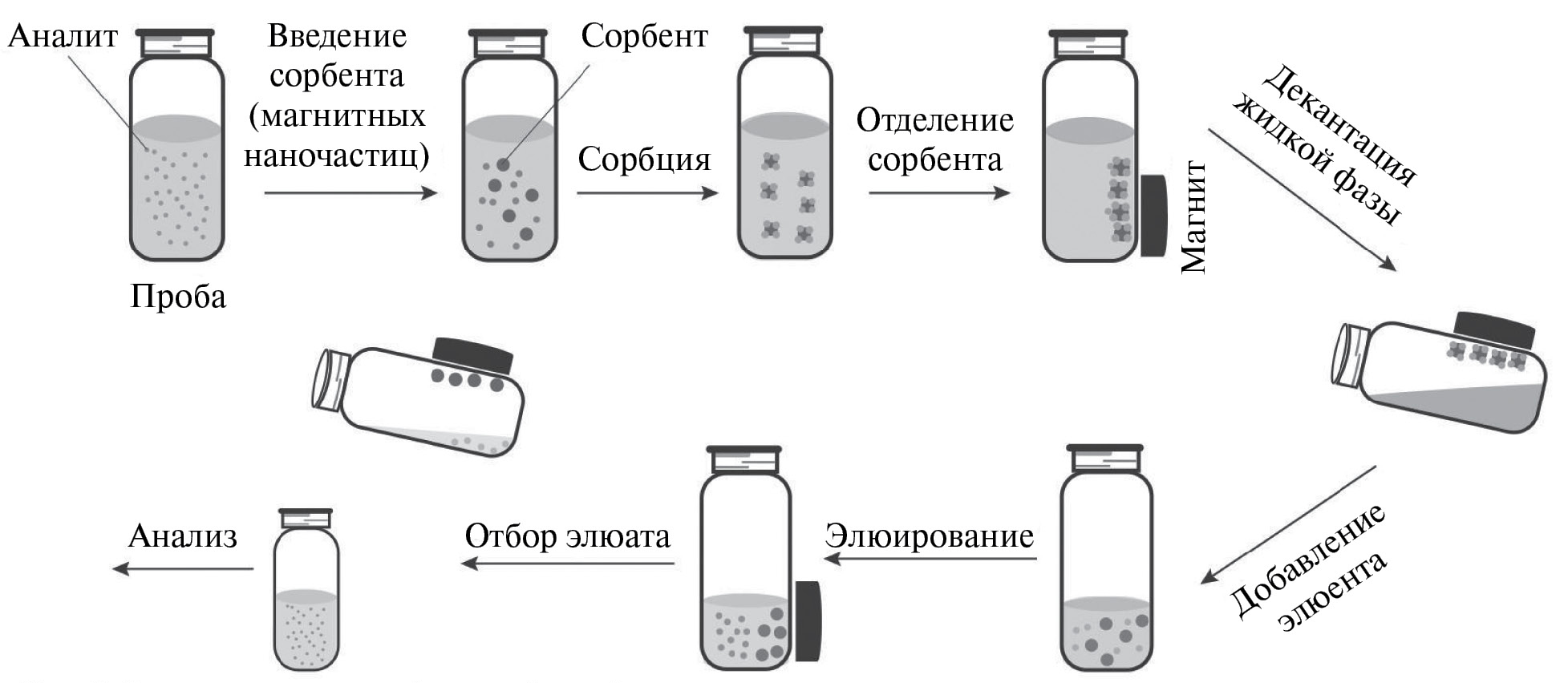 Рис. 6. Схема дисперсионной твердофазной микроэкстракции с применением магнитных наночастиц.