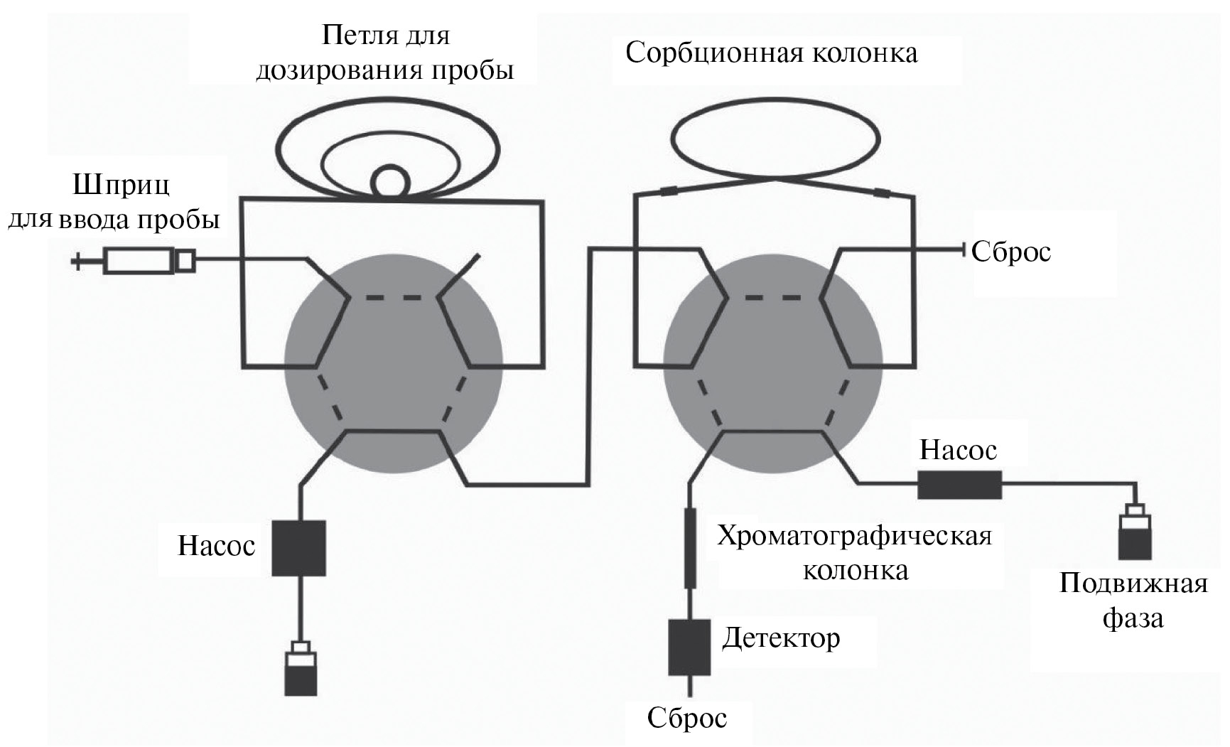 Для автоматизации процесса сорбции аналитов из проб и осуществления его в режиме онлайн предложена проточная ТФМЭ в капилляре, последовательно соединенном с системой для хроматографического анализа (рис. 7) [30]. Как правило, сорбент помещают в капилляр в дисперсном состоянии [97], наносят на стенки капилляра [98, 99] или получают в капилляре in situ в виде монолита [100]. Элюат из капилляра напрямую подают в хроматографическую колонку. Данный подход продемонстрирован в работе [100]. На первом этапе через систему пропускали раствор-носитель (водный раствор, содержащий ацетонитрил и трифторуксусную кислоту) для кондиционирования сорбционной колонки. Затем в дозирующую петлю отбирали водно-органический экстракт пробы риса, содержащий зеараленон, афлатоксин B1 и стеригматоцистин. В капилляре с сорбентом происходила сорбция аналитов. С помощью второго насоса в капилляр подавали подвижную фазу (ацетонитрил и раствор трифторуксусной кислоты) для элюирования аналитов; элюат направляли в систему для ВЭЖХ—МС/МС-анализа. Способ позволил достичь высоких значений коэффициентов концентрирования (72—99). В работе [97] для выделения зеараленона, цитринина и охратоксина А из молочных продуктов после депротеинизации в режиме онлайн использовали капилляр, в который помещали допированные графеном полимерные нановолокна. Возможности применения капилляров с частицами углеродного гидрофобного материала (Carboxen) показаны при ВЭЖХ—МС/МС-определении патулина во фруктовом соке и сухофруктах [98], а также охратоксинов А и В в пробах орехов, кукурузных зерен, риса и пшеничной муки [99].