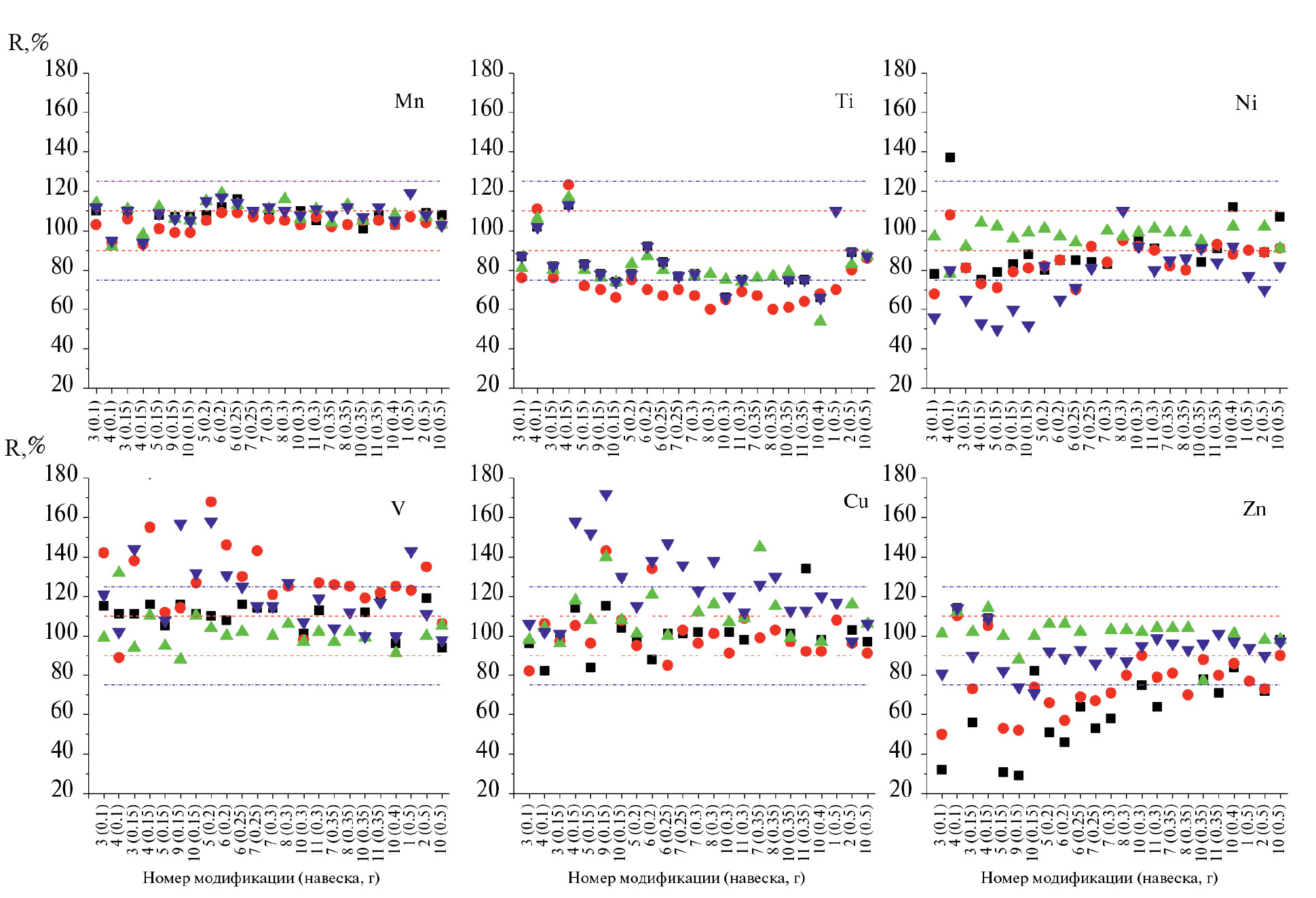 Для всех исследованных элементов (рис. 2) использование комбинации кислот 4N-1.5OH-0.05F-1Cl (модификация 10 реакционной смеси) при минерализации 0.5 г любых видов растений расширило круг элементов, определяемых методом АЭС-ИСП, в сравнении с данными [7, 15—18, 20, 21, 23, 25].