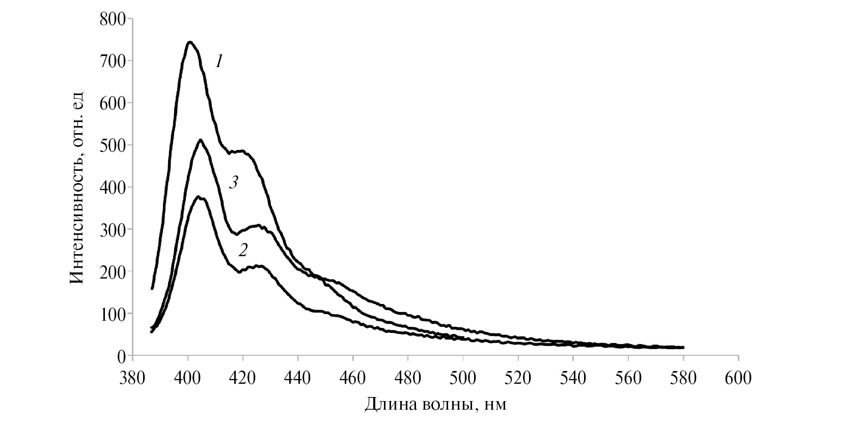 Рис. 1. Спектры флуоресценции систем, содержащих молекулы пирена (5.0×10–8 М) в присутствии растворов цетилтриметиламмоний бромида (ЦТМА) и аквазоля серебра различных концентраций, полученные при λвозб = 350 нм. 1 − концентрация ЦТМА 0.5 мМ, концентрация аквазоля серебра 1.0 × 10–6 М; 2 − концентрация ЦТМА 1.5 мМ, концентрация аквазоля серебра 1.0×10–7 М; 3 − концентрация ЦТМА 1.5 мМ, концентрация аквазоля серебра 5.0×10–7М.