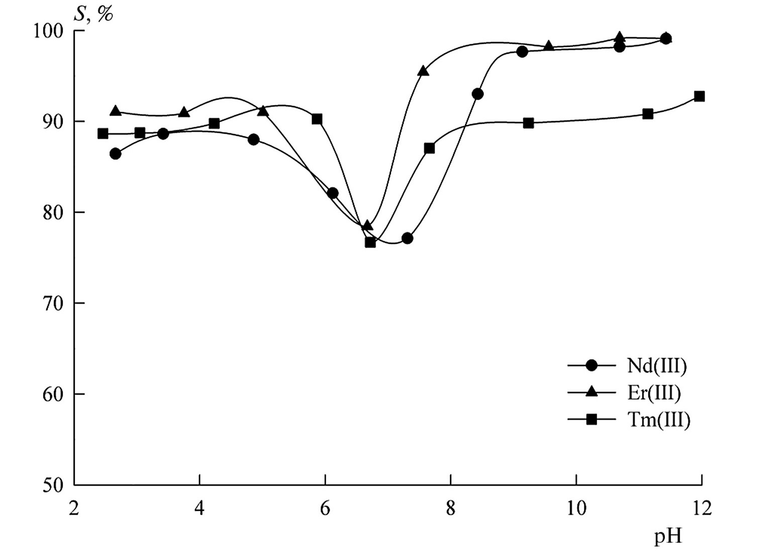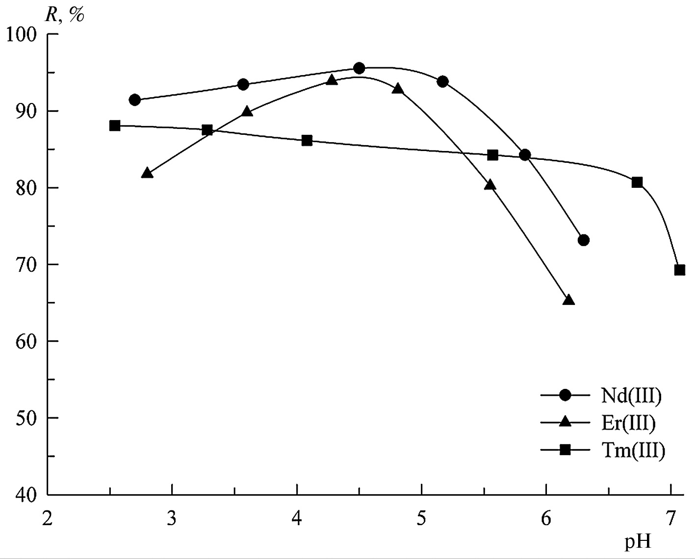 Согласно полученным результатам, извлечение ионов неодима(III), эрбия(III) и тулия(III) происходит в кислой среде (рН 2.2–3.3). Однако, как отмечено выше, флотационное извлечение редкоземельных элементов додецилсульфатом натрия в кислой среде практически не происходит, а начинается при рН > 6.0 за счет извлечения гидроксидодецилсульфатов [4]. В связи с этим изучена флотация рассматриваемых ионов РЗЭ алкилбензолсульфокислотой при подщелачивании растворов.