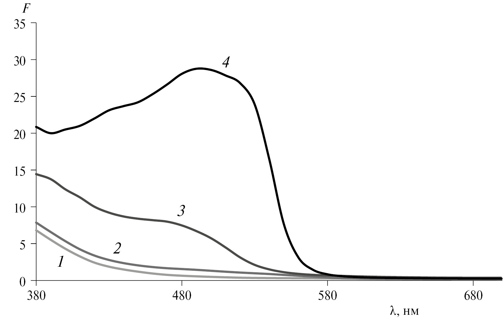 Заметны также значительные изменения на поверхности волокна (рис. 2б), указывающие на взаимодействие ионов металла с реагентом. Изучили зависимость от длины волны функции Кубелки − Мунка (F) сорбентов в отсутствие и в присутствии на сорбентах иммобилизованного реагента и его комплекса с ионами меди. Функцию Кубелки − Мунка рассчитывали по коэффициентам диффузного отражения, полученным с помощью Eye-One Pro, по следующей формуле: