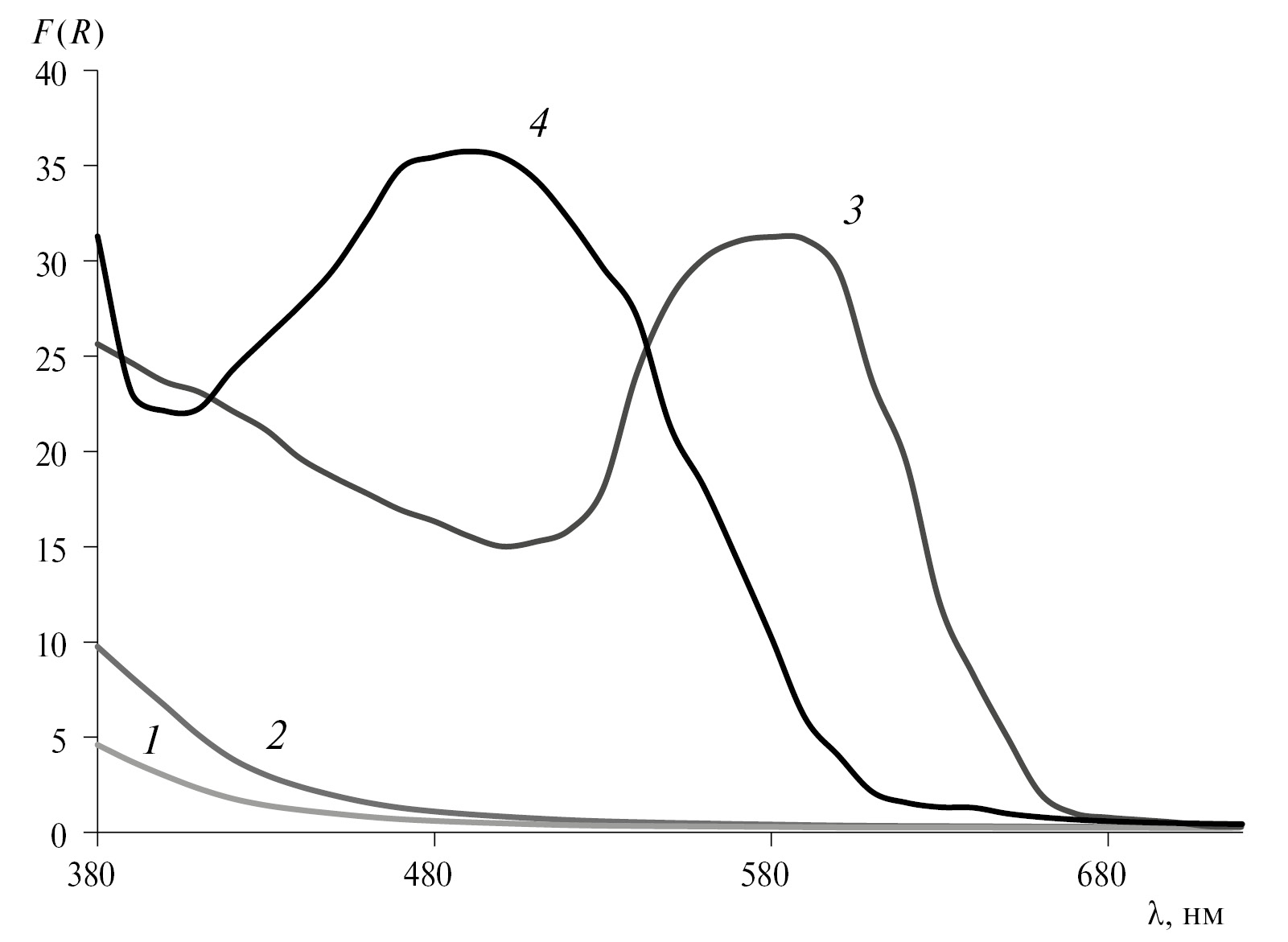 Рис. 4. Спектры диффузного отражения сорбентов ППФ-1 (1), ППФ-1 в Cl-форме (2), с иммобилизованным тороном I (3) и его комплексом с ионами меди(II) (4).