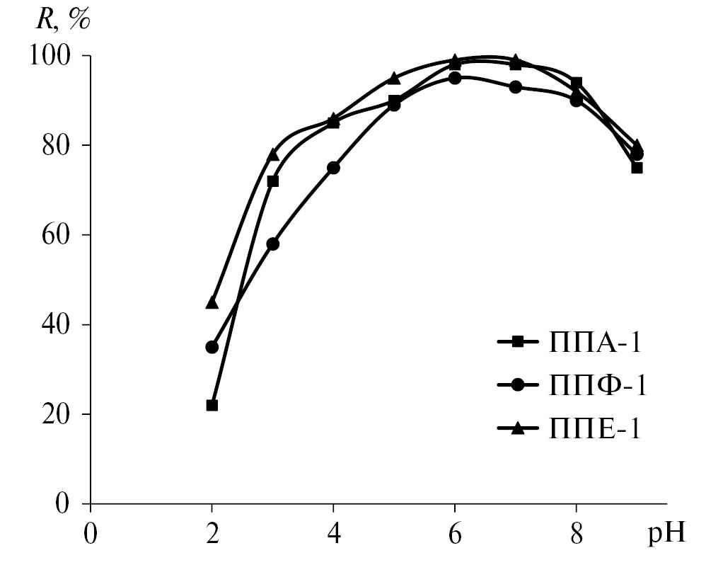Изучили сорбцию ионов меди(II) в диапазоне pH 2.0−9.0. Из рис. 5 видно, что степень сорбции повышается с увеличением pH и достигает максимума в диапазоне рН 6−8. Это интервал рН выбрали в качестве наиболее подходящего для дальнейшей работы.