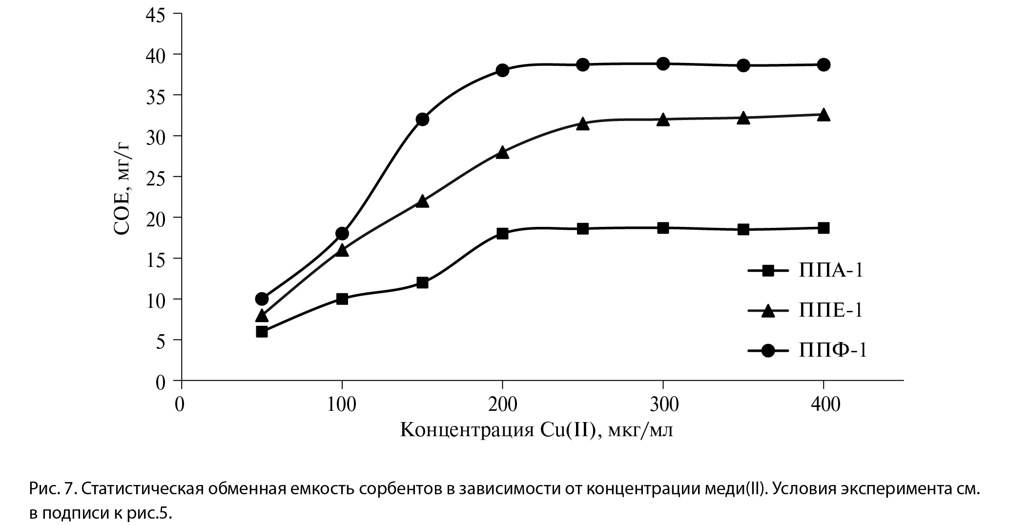 Важным фактором, определяющим сорбционную способность сорбентов, является их обменная емкость. Для ее определения через 200 мг сорбента пропускали 10 мл растворов меди(II) с концентрацией в диапазоне 50−500 мкг/мл при pH 6.0 в течение 2 ч. Приведенные на рис. 7 зависимости обменной емкости ППФ-1, ППА-1 и ППЕ-1 от концентрации меди(II) показали, что на указанных сорбентах ее максимальные значения составляют 39, 19 и 33 мг/г соответственно. Следовательно, наиболее перспективным сорбентом для выделения меди является ППФ-1.