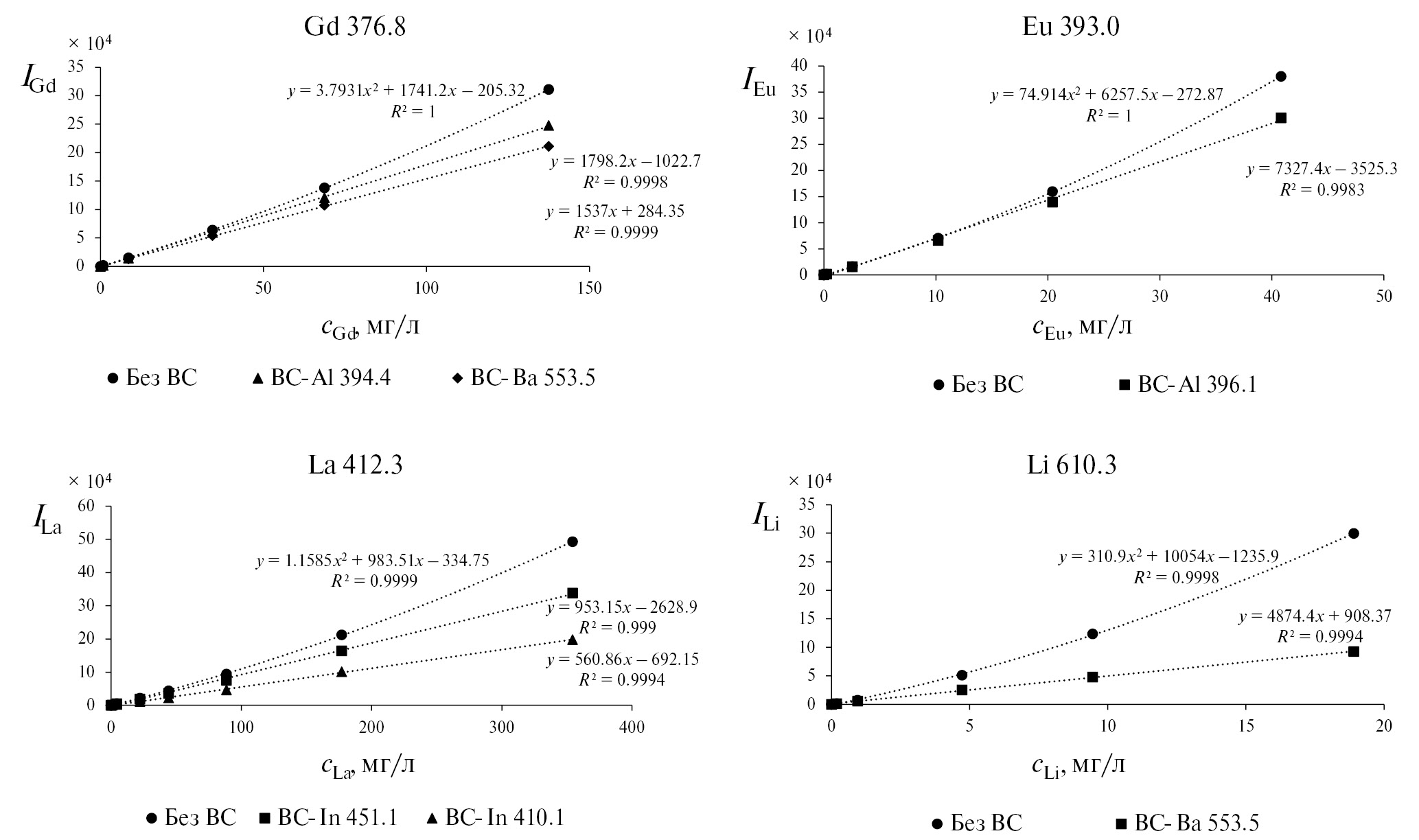 Как следует из табл. 1, Ba, In и Al являются наиболее близкими к La по энергетическим характеристикам. Для четырех линий лантана эти элементы подходят в качестве ВС, использование Ga (максимальная разница с La в энергиях ионизации) не позволяет добиться линейной аппроксимации и удовлетворительной открываемости. Для Gd ближе всего по энергии ионизации Al и Ga. Линии этих элементов показали наилучшие результаты аналитической открываемости при линейной аппроксимации. Использование Ba (табл. 2) для коррекции сигналов Gd впоследствии не дало положительных результатов при анализе реальных образцов. Для Eu наиболее подходящими ВС являются Ba, In и Al. Наилучшие результаты при линейной аппроксимации градуировочных зависимостей получаются при использовании Ba. Важно, что при использовании ВС градуировочные функции для РЗЭ линеаризуются (рис. 2). Это делает процедуру анализа удобной, так как позволяет использовать возможности ПО спектрометра (построение градуировочных графиков в логарифмических координатах встроенным ПО не предусмотрено), а также свидетельствует о том, что изменение интенсивности аналита и ВС происходит одинаковым образом.