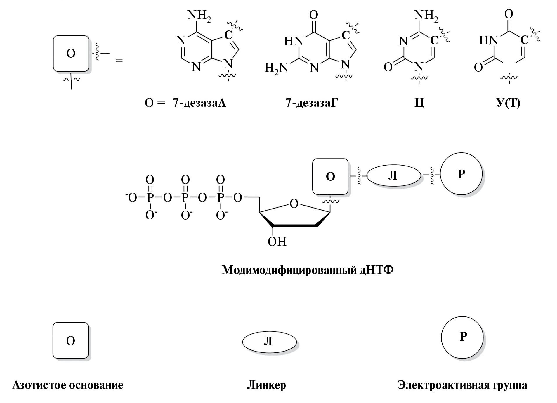 Обнаружение и идентификация нуклеиновых кислот – одно из центральных направлений современной биологической химии. Ферменты, модифицирующие нуклеиновые кислоты, такие как полимеразы, лигазы и нуклеазы, используемые в генотипировании, пока не нашли широкого применения в электрохимических методах анализа. Таким образом, необходимо прилагать дополнительные усилия для более тесной интеграции электрохимии и молекулярной биологии. Электрохимические методы, обладая высокой чувствительностью, низкими затратами на оборудование, возможностью миниатюризации и прямым электронным считыванием, являются привлекательной альтернативой общепринятым методам обнаружения нуклеиновых кислот, основанным на колориметрии или турбидиметрии. Хотя регистрация сигнала электроактивных нуклеиновых кислот может быть достигнута с помощью высокоэффективной жидкостной хроматографии или капиллярного электрофореза в сочетании с электрохимическим детектором, эти методы не подходят для миниатюризации анализа. Из известных электрохимических подходов маркировка электроактивными фрагментами обладает совокупными преимуществами: положительным сигналом обнаружения, низким фоном и возможностью введения нескольких электрохимически различимых меток. Современное развитие ДНК-технологий открывает все новые области применения синтетических модифицированных нуклеотидов, несущих электроактивные фрагменты, включая разработку портативных анализаторов для обнаружения патогенных микроорганизмов и вирусов in situ, электрохимических подходов к генотипированию, систем для анализа экспрессии генов, секвенирования нуклеиновых кислот, методов определения гибридизации и повреждения нуклеиновых кислот, а также регистрации взаимодействий ДНК–белок. Разработка, синтез и проверка производных нуклеотидов на электрохимическую активность и в качестве субстратов ДНК- и РНК-полимераз – новое направление на стыке органической, биологической и аналитической химии.