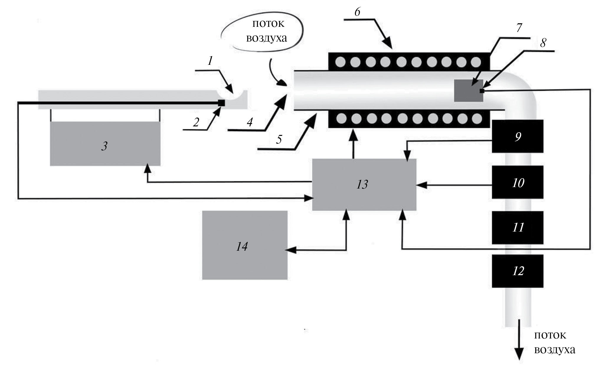Рис. 1. Схема экспериментальной окситермографической установки для исследования образцов полимеров методом окситермографии. 1 – кварцевая лодочка, 2 – термопара, 3 – узел введения кварцевой лодочки в реактор, 4 – входное отверстие в температурный реактор, 5 – кварцевый высокотемпературный реактор, 6 – нагревательный элемент, 7 – катализатор окисления отходящих газов, 8 – термопара контролирующая нагрев реактора, 9 – датчик кислорода, 10 – датчик углекислого газа, 11 – ротаметр, 12 – побудители потока воздуха, 13 – блок управления и сбора экспериментальных данных, 14 – персональный компьютер.