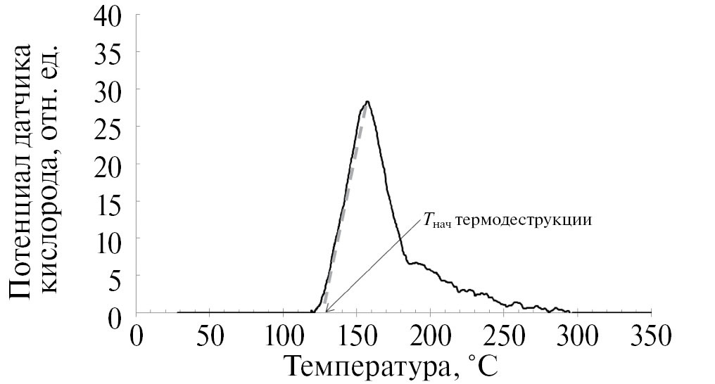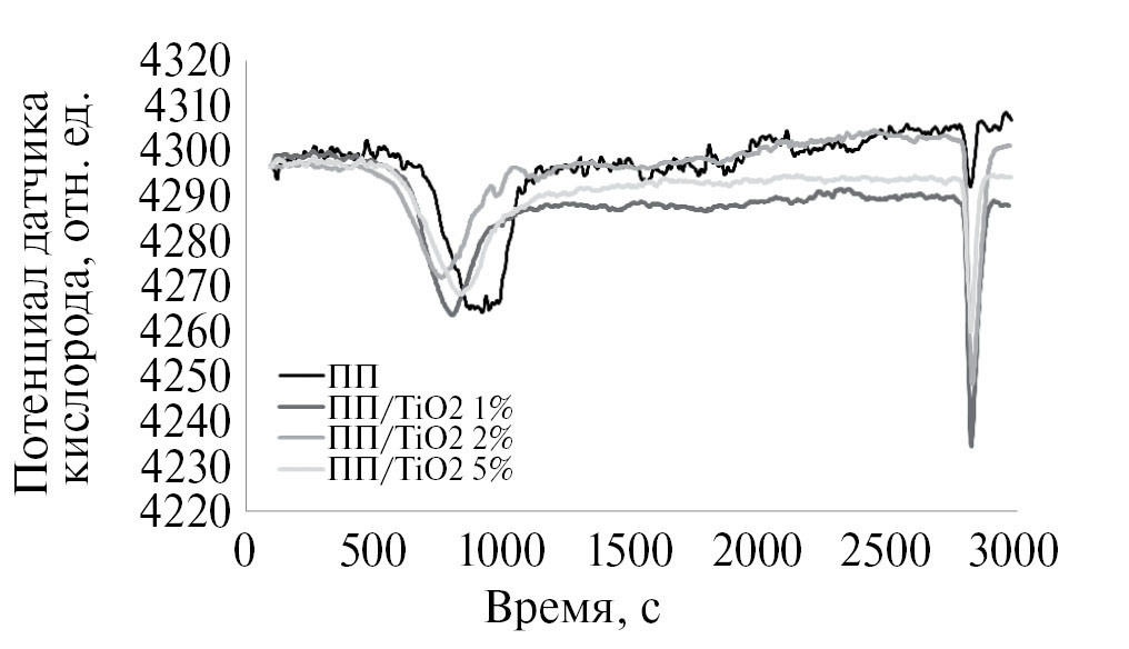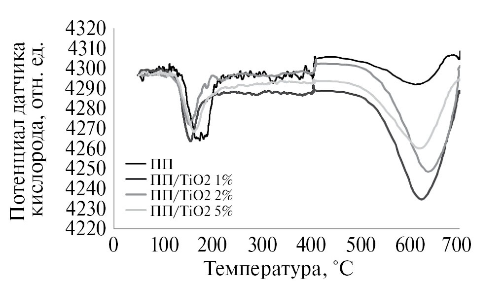 Для определения температуры начала разрушения образцов исходного полипропилена и полипропилена с добавками диоксида титана использовали экспериментальные кривые – окситермограммы, полученные с датчика кислорода, куда газ сразу поступает из реактора (см. рис. 5). Строго говоря, существует разница во времени между регистрацией температуры образца и регистрацией аналитического сигнала датчика. Это связано с переносом газа, прореагировавшего с образцом, к датчику, который регистрирует изменения газа в потоке, выходящем из реактора. Эта разница между временем окисления и временем регистрации определяется конструкцией экспериментальной установки и расходом газа, протекающим через реактор, и может быть сведена к минимуму или учитываться при построении термоокислительных спектров. В нашем случае при расходе газа 10 см3/с и объеме камеры менее 30 см3, где осуществляется программируемый нагрев анализируемого образца, разница во времени составляет менее 3 с. За это время при скорости нагрева 11.6 °С/мин разница температур составляет величину, не превышающую 0.6 градуса. Эту поправку, возможно, следует вносить в термоокислительный спектр, получаемый экспериментально.