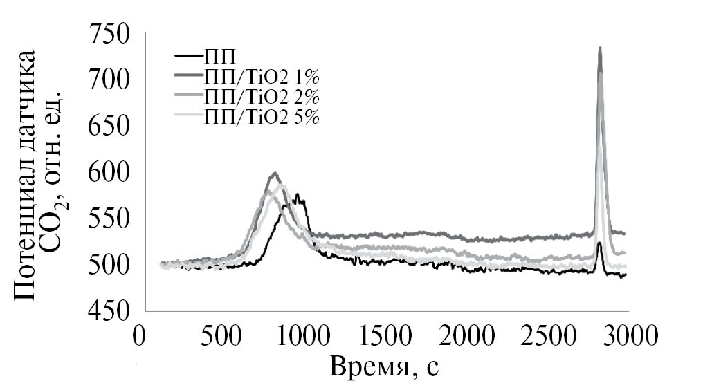 Рис. 4. Изменение содержания диоксида углерода (отн. ед.) в потоке воздуха, выходящего из реактора, в зависимости от времени для образцов чистого полипропилена (ПП) и с содержанием 1, 2 и 5% ТiO2.