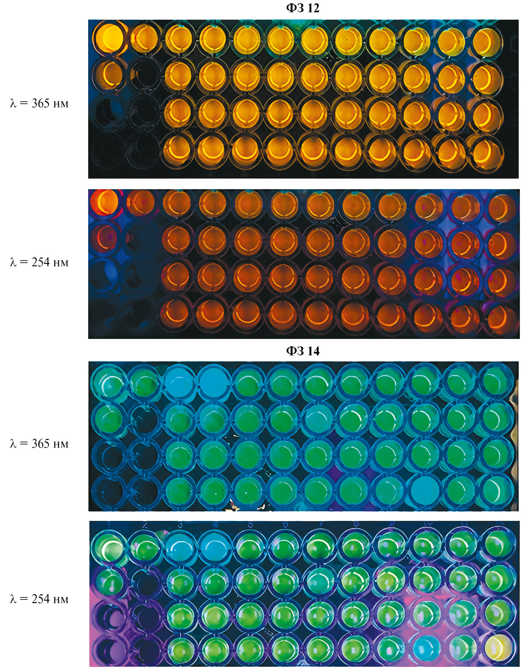 Рис. 1. Флуоресцентный отклик планшетов с ФЗ 12, ФЗ 14 с растворами тест-веществ (схема смешивания представлена в “Экспериментальной части”) при разных длинах волн источника возбуждения.