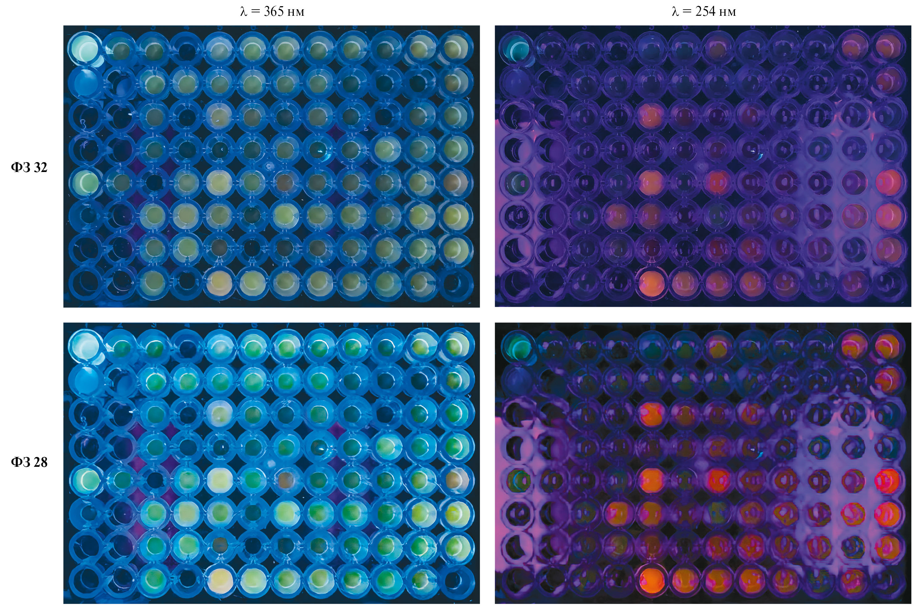 Рис. 2. Флуоресцентный отклик планшетов с ФЗ 28, ФЗ 32 с растворами тест-веществ (схема смешивания представлена в “Экспериментальной части”) при разных длинах волн источника возбуждения.