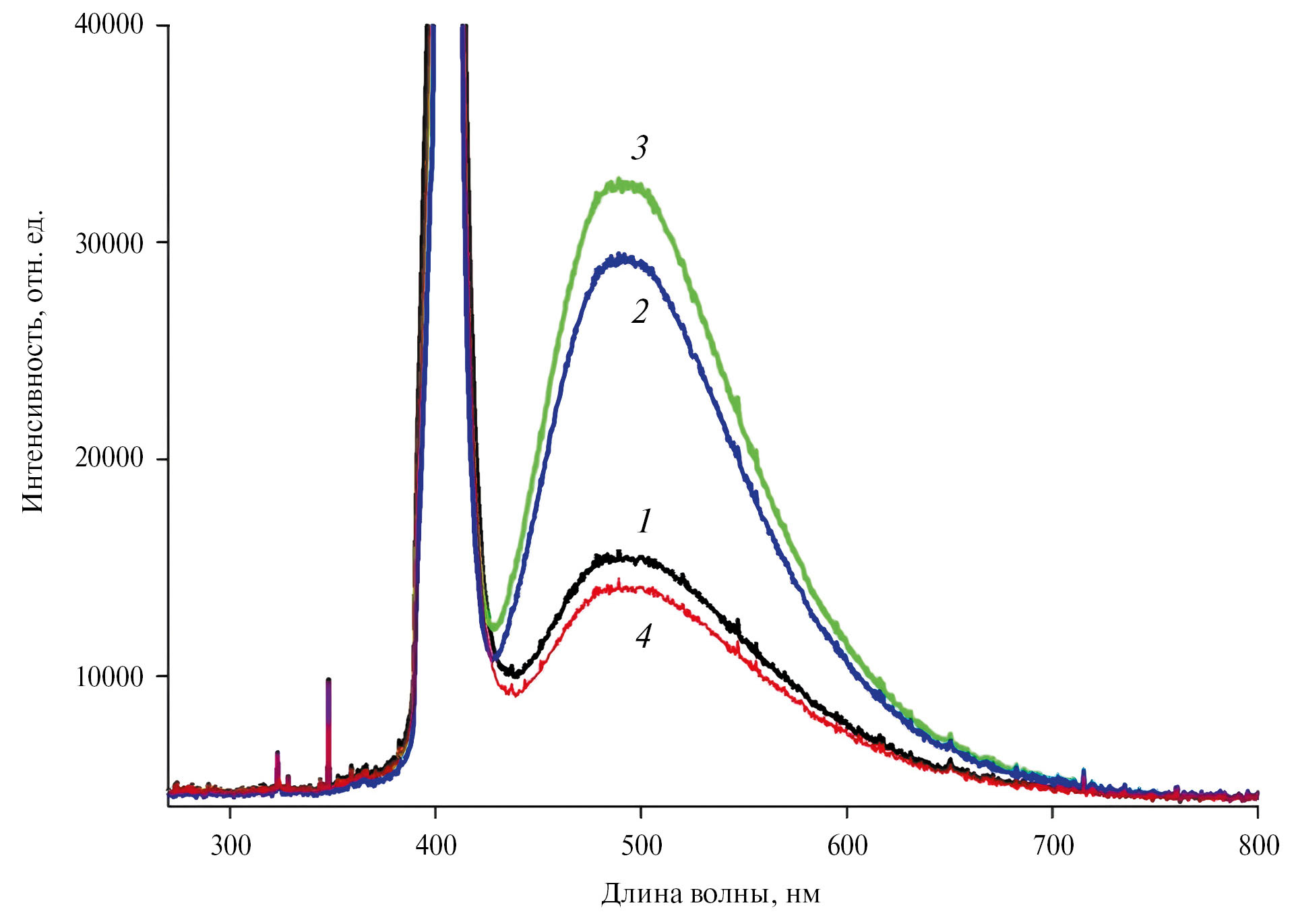 Рис. 3. Спектры флуоресценции ФЗ 32 на бумажном носителе при длине волны возбуждении 405 нм: исходный (1), под действием паров аммиака (2), метиламина (3) и уксусной кислоты (4).