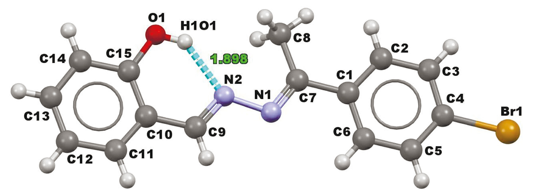 Монокристаллы реагента 2-(((1-(3-бромфенил)этилиден)гидразоно)метил)фенола (R) (C15H13BrN2O) получали его двукратной перекристаллизацией из этилового спирта. Для этого 2-(((1-(3-бромфенил)этилиден)гидразоно)метил)фенол нагревали в этаноле и после полного растворения хранили при комнатной температуре. Примерно через четыре дня начинали осаждаться желтые игольчатые монокристаллы реагента. Полученные кристаллы отделяли с помощью фильтровальной бумаги и сушили. Рентгеноструктурный анализ 2-(((1-(3-бромфенил)этилиден)гидразоно)метил)фенола проводили на дифрактометре Bruker SMART APEX II (T = 296 К, МоKα-излучение, графитовый монохроматор, φ- и ω-сканирование, 2θmax = 50.6°). Результаты измерения интенсивности отражения обрабатывали с использованием программного обеспечения SADABS. Измерили 16 436 дифракционных рефлекса. Установили, что среднее значение интенсивности эквивалентных отражений равно 3328 свободным дифракционным отражениям. Эти результаты использовали для уточнения и объяснения кристаллической структуры реагента.