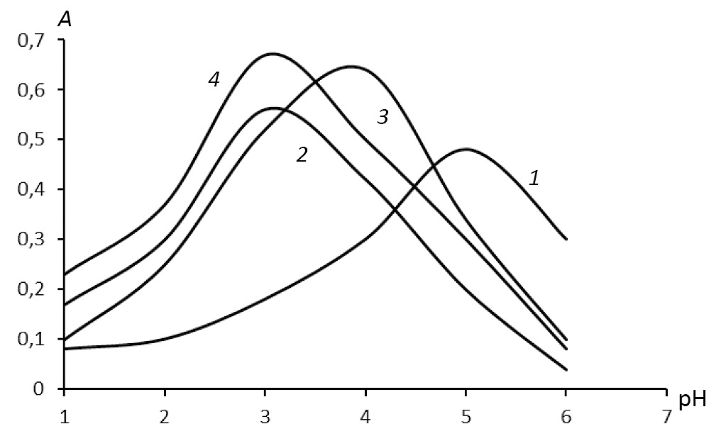 Железо(III) образует окрашенные комплексы с реагентом R в присутствии ДАМ, ДАФМ и ДАПМ. Из рис. 2 видно, что оптимальное значение pH образования бинарного комплекса железа(III) с реагентом R равно 5. При образовании смешаннолигандных комплексов оптимальное значение рН комплексообразования смещается в более кислую область и составляет: рН 3 для Fe(III)–R–ДАПМ, рН 4 для Fe(III)–R–ДАМ и рН 3 для Fe(III)–R–ДАФМ.