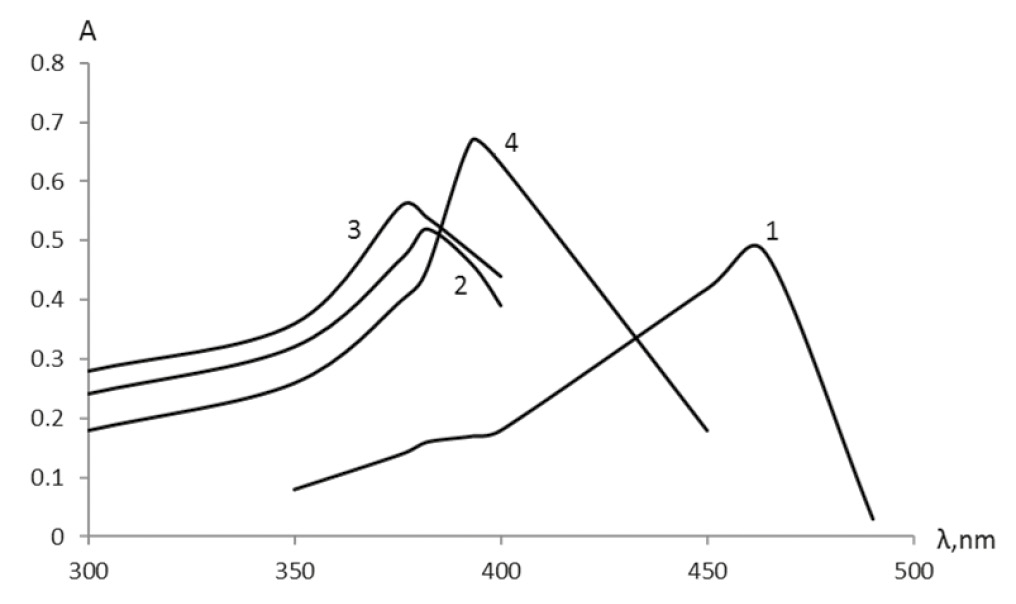 Cпектры светопоглощения комплексов в присутствии и в отсутствие ДАМ, ДАПМ и ДАФМ приведены на рис. 3. Максимальное светопоглощение бинарного комплекса с железом(III) наблюдается при 464 нм (кривая 1). При введении ДАМ, ДАПМ и ДАФМ образуются смешаннолигандные комплексы Fe(III)–R–ДАМ, Fe(III)–R–ДАФМ, Fe(III)–R–ДАПМ. Из рис. 3 видно, что при образовании смешаннолигандных комплексов происходит гипсохромный сдвиг по сравнению со спектром бинарного комплекса. Светопоглощение комплексов Fe(III)–R–ДАМ, Fe(III)–R–ДАФМ и Fe(III)–R–ДАПМ максимально при 376 нм, 393 нм и 387 нм соответственно (кривые 2–4). Это свидетельствует о том, что в исследуемых системах имеет место взаимодействие реагент–третий компонент.