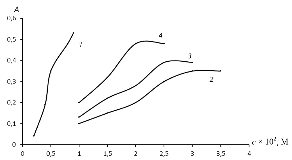 1 – Fe(III)–R, 2 – Fe(III)–R–ДАПМ, 3 – Fe(III)–R–ДАМ, 4 – Fe(III)–R–ДАФМ. cFe = 4 × 10-5 M; cR = 0.002 M; cДАМ, ДАФМ, ДАПМ = 0.01; λопт = 490 нм (Fe(III)–R), λопт = 400 нм (Fe(III)–R–ДАПМ, Fe(III)–R–ДАМ, Fe(III)–R–ДАФМ); КФК-2; l = 1 см.