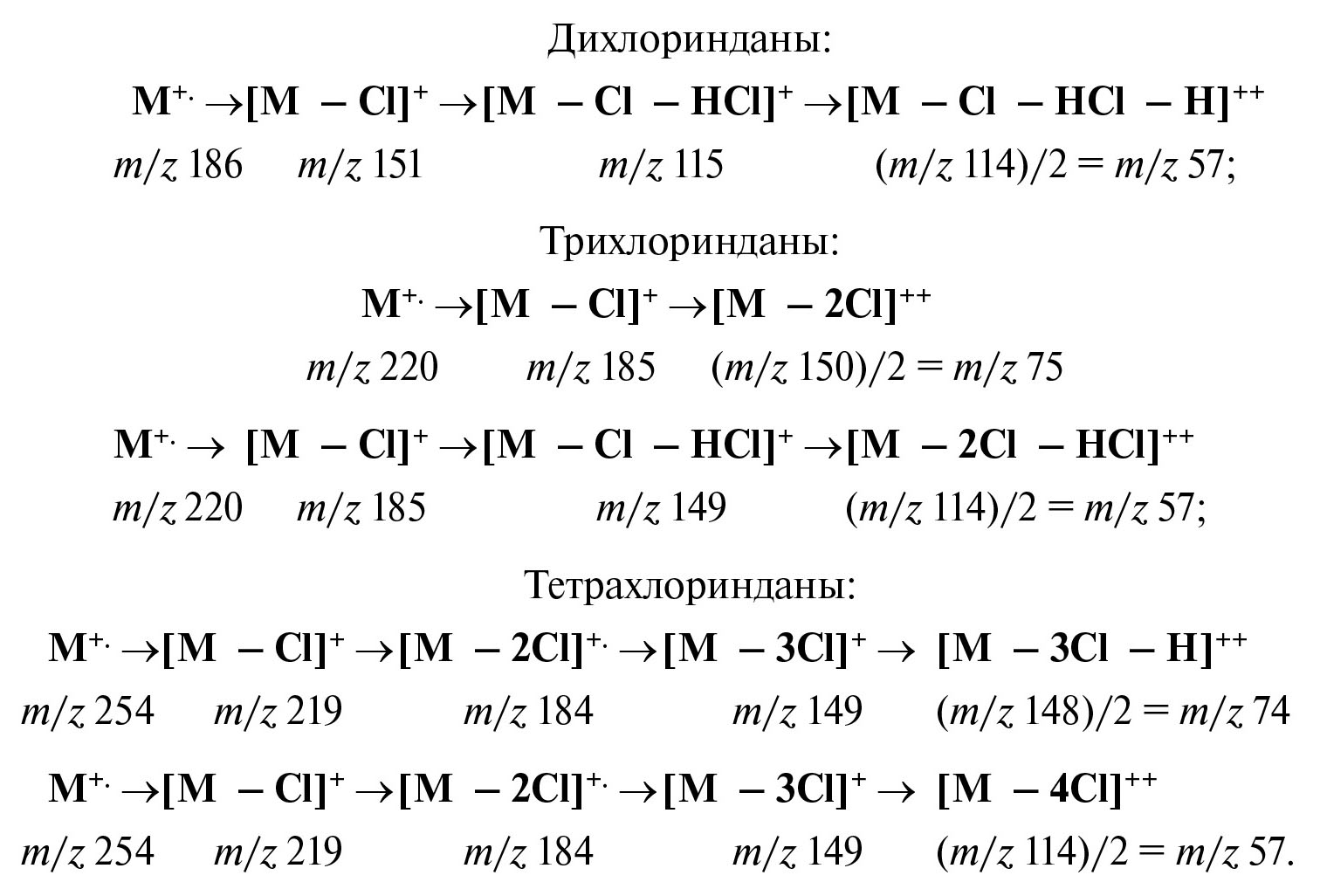 Исходные результаты хромато-масс-спектрометрического анализа (масс-спектры и индексы удерживания) реакционных смесей продуктов свободнорадикального хлорирования индана приведены в табл. 2. Для сравнения (без дальнейшего подробного рассмотрения) в табл. 3 приведены аналогичные результаты для продуктов хлорирования тетралина, представляющие интерес для обсуждения особенностей реакции. По приведенным данным можно установить только молекулярные формулы продуктов хлорирования, поскольку интерпретация их индексов удерживания невозможна именно из-за отсутствия справочной информации.