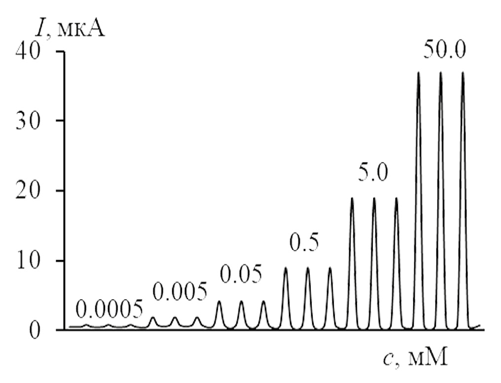 В рамках фармацевтического анализа, как известно, для определения различных органических соединений широко используются электрохимические сенсоры, обладающие стабильным и чувствительным откликом [12, 13]. При их создании рабочую поверхность электрода (обычно из углеродного материала) модифицируют с целью улучшения аналитических и метрологических характеристик отклика. Модификация поверхности электрода способствует уменьшению перенапряжения окисления органических соединений, наблюдаемого на углеродных электродах, а также снижению нижней границы определяемых содержаний [14]. В итоге применение химически модифицированных электродов (ХМЭ) приводит к повышению чувствительности и селективности вольтамперометрического отклика на органические соединения, в том числе цефалоспорины [15–17]. Не менее важно и то, что ХМЭ могут “работать” как амперометрические детекторы в проточных системах, что позволяет проводить большое количество измерений с высокими чувствительностью и селективностью в автоматизированном режиме быстро и с низкими затратами [18, 19]. С целью автоматизации анализа объектов окружающей среды и объектов биомедицины чаще всего используют проточно-инжекционные системы [20–23].