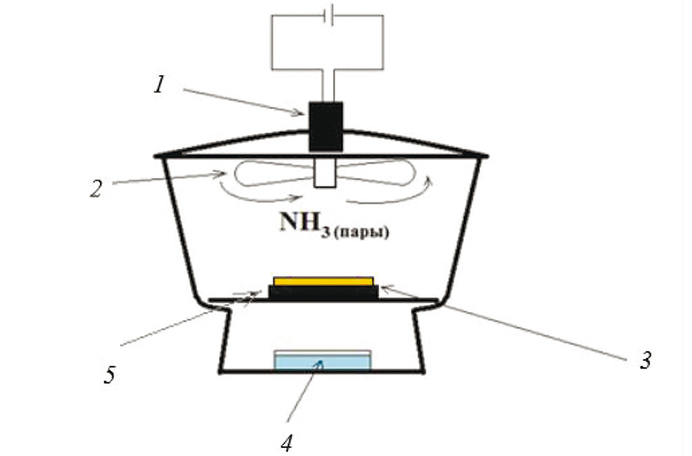 Рис. 1. Схема установки для внедрения частиц магнетита в пленки. 1 – мотор, 2 – вентилятор, 3 – пленка, 4 – водный раствор аммиака, 5 – магнитная платформа.