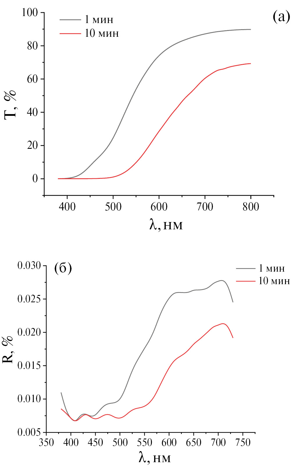 Рис. 3. Спектры пропускания (а) и отражения (б) пленок, полученных выдерживанием в течение разного времени в солях железа: сFe(III) = 0.10 М, сFe(II) = 0.05 М, мощность УЗ-излучения 60 Вт, частота 40 кГц.