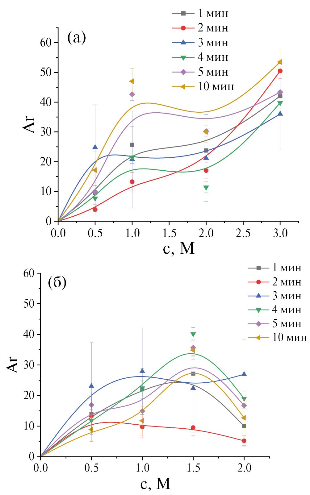 Рис. 4. Концентрационные зависимости интенсивности цветовых параметров Ar пленок с разным временем импрегнирования солями железа в растворах KCl (а) и MgCl2 (б).