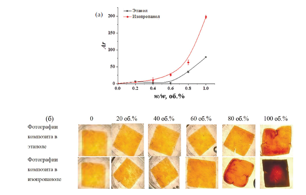 Рис. 5. Зависимость интенсивности цветовых параметров Ar от объемной доли спиртов в индивидуальных водно-спиртовых растворах (а) и фотографии пленки после выдерживания в растворах (б).