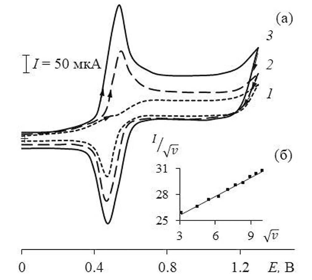 Циклические вольтамперограммы (ЦВА) регистрировали с помощью бипотенциостата DropSens μSTAT400 (Испания) с трехэлектродной электрохимической ячейкой объемом 10 мл, в которой рабочим электродом являлся СУЭ. В качестве электрода сравнения и вспомогательного электрода применяли хлоридсеребряный и платиновый электроды соответственно. Циклические вольтамперограммы регистрировали при скорости наложения потенциала (v) 10–100 мВ/с.
