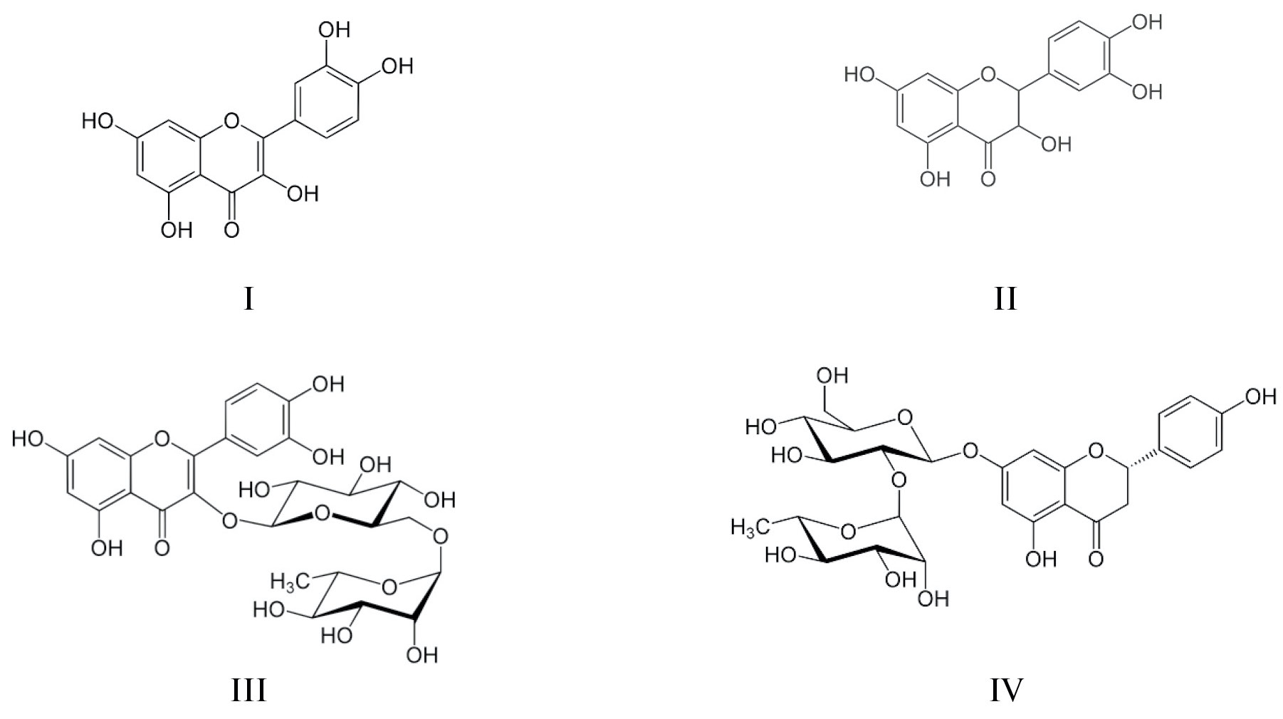 Схема 1. Структурные формулы флавоноидов: кверцетин (I), дигидрокверцетин (II), рутин (III), нарингин (IV).