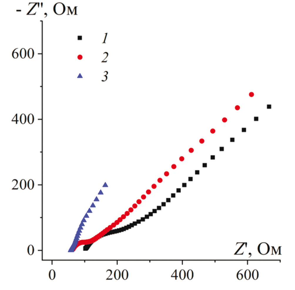 Рис. 2. Диаграммы Найквиста для СУЭ (1), Au–СУЭ (2) и МУНТ–ИЖ–Au–СУЭ (3) в присутствии 0.01 М раствора K4[Fe(CN)6]/K3Fe(CN)6 на фоне 0.05 М H2SO4 в диапазоне частот от 0.04 Гц до 100 кГц с амплитудой 5 мВ при потенциале 0.31 В.