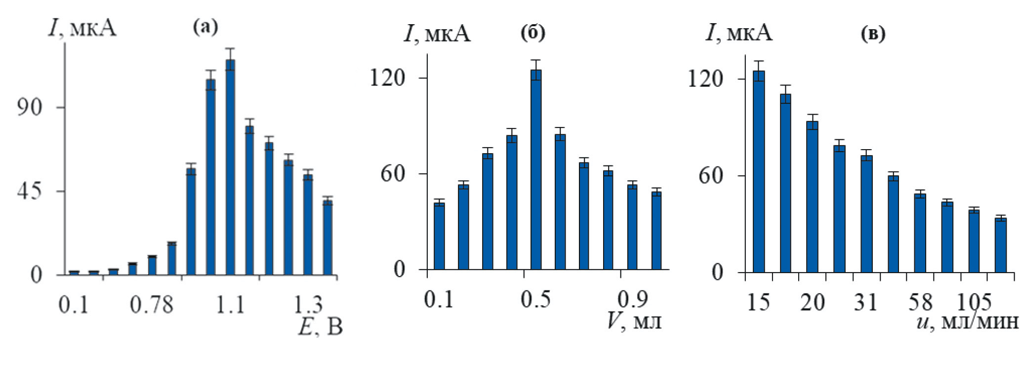 Методика выполнения эксперимента заключается в следующем: инжекцию небольшого количества пробы осуществляли с помощью электронной микропипетки, погруженной в раствор фонового электролита в направлении непосредственно на поверхность рабочего электрода, который расположен в нижней части электрохимической ячейки поверхностью вверх на небольшом расстоянии от наконечника микропипетки. Аналитический сигнал измеряли в потенциостатическом режиме. В этом случае на чувствительность амперометрического определения влияет величина накладываемого потенциала (Е), объем инжектируемой пробы (V) и скорость инжектирования (u). В качестве примера на рис. 3 приведены зависимости тока, регистрируемого при амперометрическом определении сульфаметазина в условиях ПрИА, от Е, V и u. Для остальных исследуемых соединений получили аналогичные зависимости. Значения, отвечающие максимальному аналитическому сигналу, а именно: Е = 1.15 В, V = 0.60 мл и u = 15 мл/мин выбрали как рабочие для дальнейших измерений.
