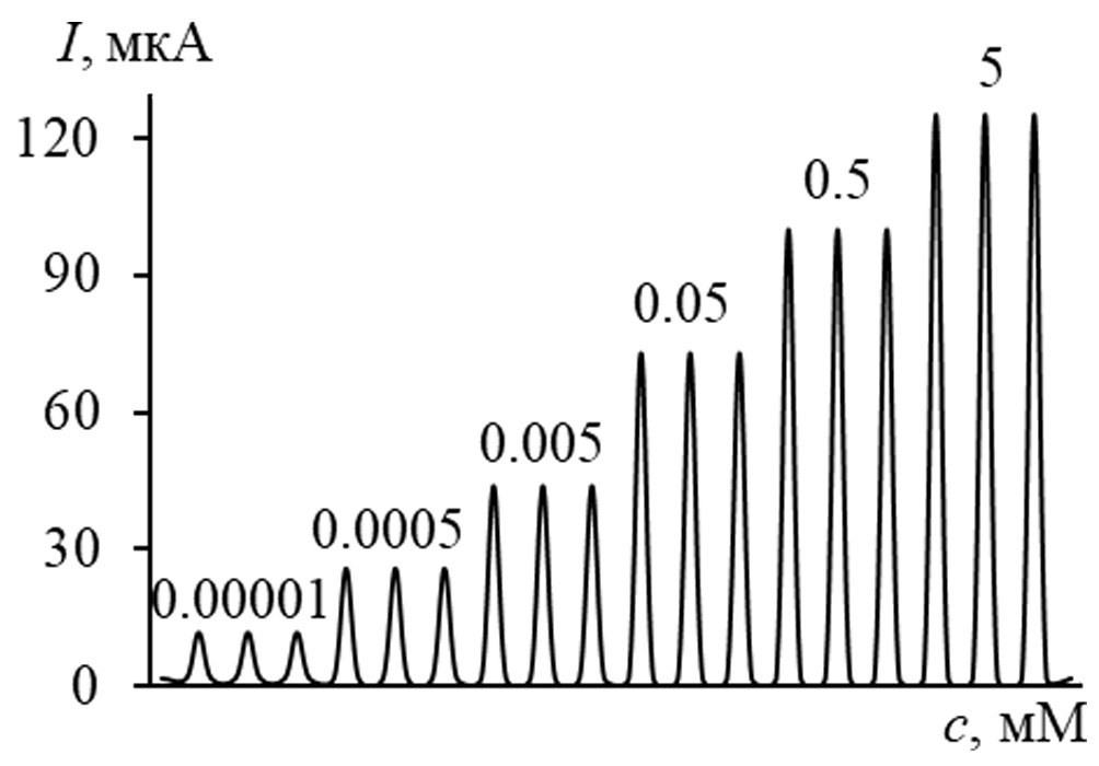 На рис. 4 показана зависимость аналитического сигнала от концентрации аналита при амперометрическом определении сульфаметазина в условиях ПрИА. При использовании химически модифицированных электродов (ХМЭ) в варианте ПрИА в меньшей степени происходит вымывание модификатора с поверхности электрода по сравнению с классическим проточно-инжекционным анализом (ПИА), поскольку отсутствует постоянно движущийся поток раствора-носителя. Рассчитанные значения sr регистрируемых сигналов не превышают 2.0% (n = 10, P = 0.95), что говорит о хорошей воспроизводимости аналитического сигнала в проточных условиях.