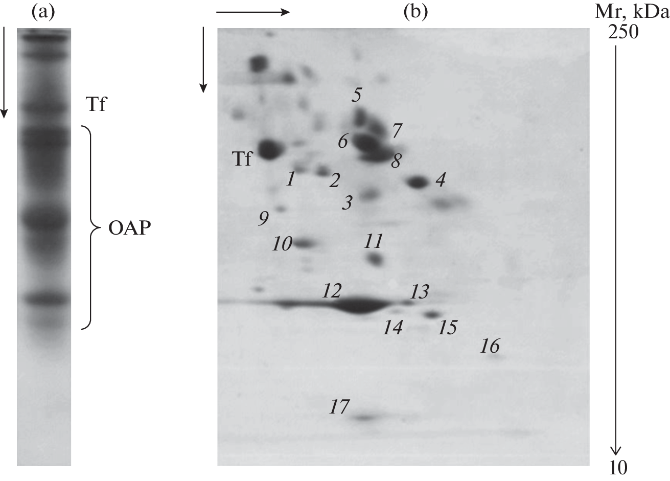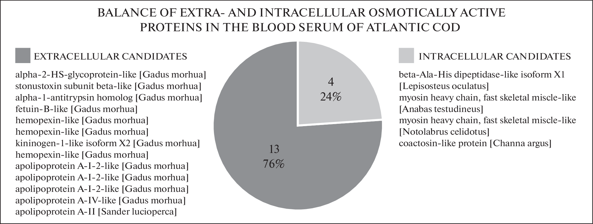 A search and identification of osmotically active proteins (OAP) in the composition of blood serum anodic fraction from Atlantic cod Gadus morhua were undertaken using polyacrylamide gel electrophoresis and MALDI mass-spectrometry. 17 OAP have been identified. According to the annotations of Gene Ontology for candidates, 13 OAP were classified as extracellular and 4 OAP- as intracellular proteins. The relative content of OAP in cod serum was ~50% of the total protein. Extracellular proteins apolipoproteins (in the composition of high-density lipoproteins) and hemopexin were dominated in OAP pool. Moreover, the relative content of ApoA-I was ~25% of the total serum protein. Of the intracellular proteins on the serum proteomic map, low molecular weight fragments of the myosin heavy chain were dominated. The results obtained are consistent with the provisions of the “albumin-free” hypothesis of capillary exchange, which considers multiple extracellular and intracellular proteins from different functional classes as osmotically active plasma proteins of “albumin-free” teleost fish.