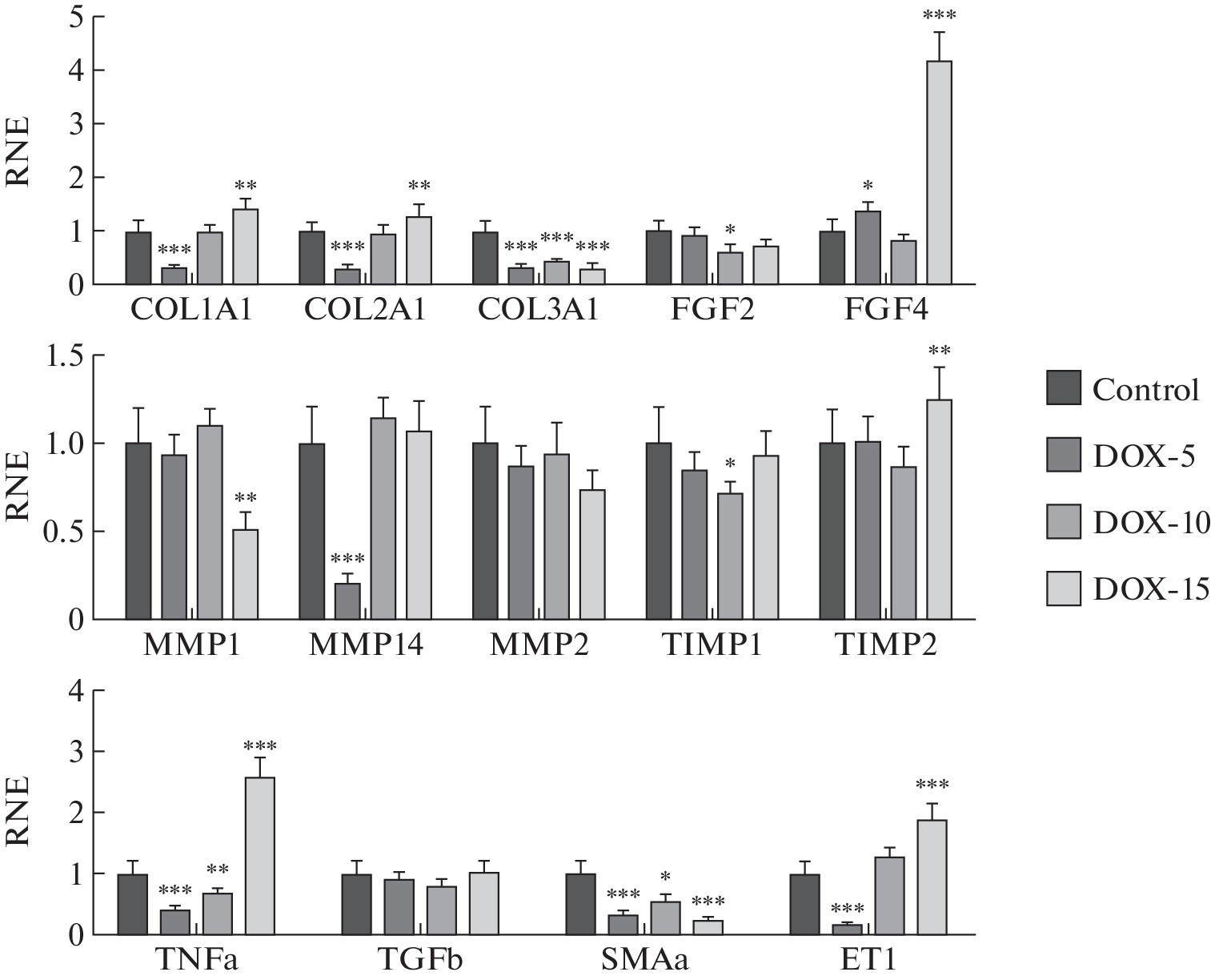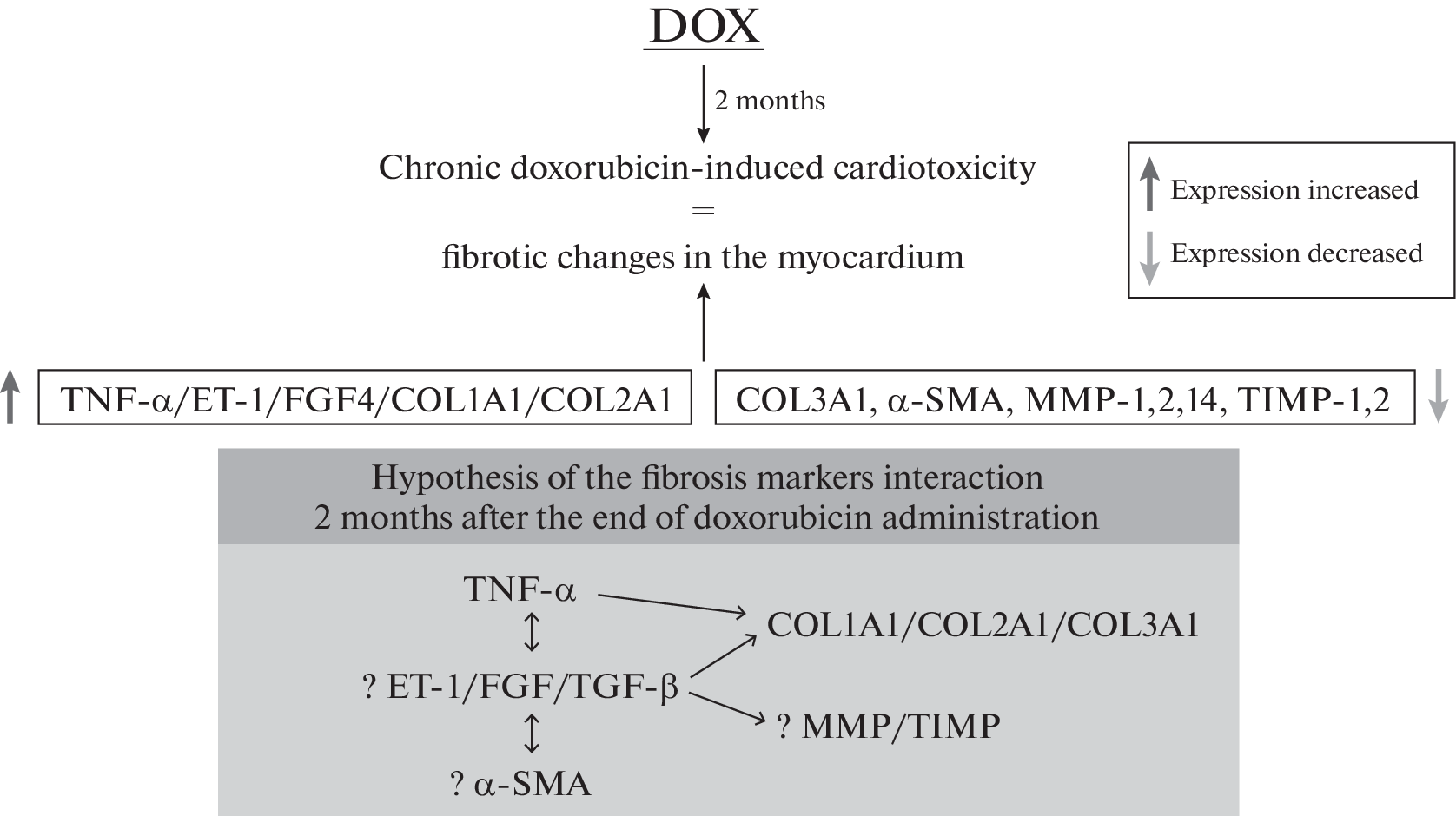 Text of the abstract. The study is devoted to the investigate of the molecular markers profile of fibrosis when various doses of doxorubicin are administered to Wistar drain rats. The study was performed on 40 male Wistar rats weighing 260 ± 19 g. Animals were divided into 4 groups: control and three experimental groups with a certain frequency of administration (6 times in two days) and a certain dose of doxorubicin (5, 10, 15 mg/kg, intraperitoneally). At the end of the administration of the chemotherapy drug, the animals were observed for 2 months. To solve this aim, the hearts were taken from anesthetized animals for molecular and morphological studies. Histological, echocardiographic and molecular analyses revealed dose-dependent damaging changes in the left ventricular myocardium against the background of exposure to various doses of doxorubicin. The expression level of TGF-β did not differ from the control values 2 months after the end of administration of all cumulative doses of the chemotherapy drug. However, at this stage of the study, the preserved increased expression of type I, type II collagen, ET-1, FGF4 and TNF-α was characteristic of animals receiving the maximum cumulative dose of doxorubicin, which may reflect the incompleteness of the fibrous tissue formation process, as well as their active participation in the development of inflammatory processes with pronounced cardiotoxic damage against the background of exposure the chemotherapy drug. For animals receiving 10 mg/kg, there were no changes in these molecular markers of fibrosis compared to the control group, whereas in the group of animals with the minimum cumulative dose of the drug, a decrease in the expression of COL I, II type, ET-1, TNF-α and an increase in FGF4 levels were revealed.