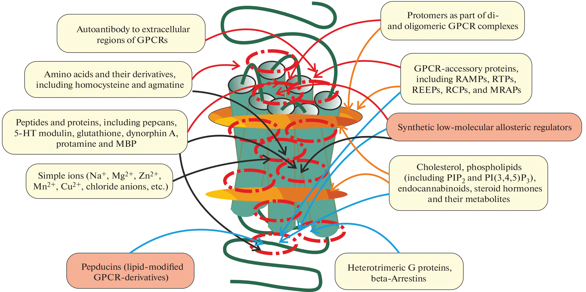 Membrane G protein-coupled receptors (GPCRs) are key components of most eukaryotic signaling systems, transducing external signals to intracellular effector proteins. Activation of GPCRs occurs through the specific binding of ligands of different nature to their orthosteric site. However, regulation of the affinity of an orthosteric agonist for the receptor, control of its effectiveness, and selection of the preferentially activated intracellular signaling cascade is carried out using allosteric mechanisms. This is due to the presence in GPCRs of many allosteric sites, which differ in structural and functional organization and topology in the receptor molecule, and are located in all its functional subdomains. The endogenous regulators of these sites are simple ions (Na+, Zn2+, Mg2+, Ca2+, Cl– and others), lipids (cholesterol, phospholipids, steroids), amino acids and their derivatives, polypeptides, as well as signaling proteins that form functionally active complexes with GPCRs (G proteins, β‑arrestins, RAMPs), and autoantibodies to the extracellular regions of GPCRs. Based on pharmacological activity, ligands of allosteric sites of GPCRs are divided into positive, negative or silent modulators of the effects of orthosteric agonists, as well as full and inverse agonists or neutral antagonists, which affect the basal activity of the receptor in the absence of an orthosteric agonist, although combining the properties of a modulator and an agonist is also possible. The multiplicity of allosteric sites and allosteric regulators, complex interactions between them, and the involvement of allosteric mechanisms in the formation of receptor complexes play a key role in fine-tuning the functional activity of signaling cascades, in biased agonism, and predetermine the processes of receptor desensitization and the fate of the receptor complex after hormonal signal transduction. The review summarizes and analyzes current concepts and new trends in the field of studying the allosteric regulation of GPCRs, the localization and functional role of allosteric sites, and their endogenous and synthetic ligands. As an example, synthetic allosteric regulators of the receptors of thyroid-stimulating and luteinizing hormones, as potential drugs for the correction of endocrine disorders, are discussed in detail.