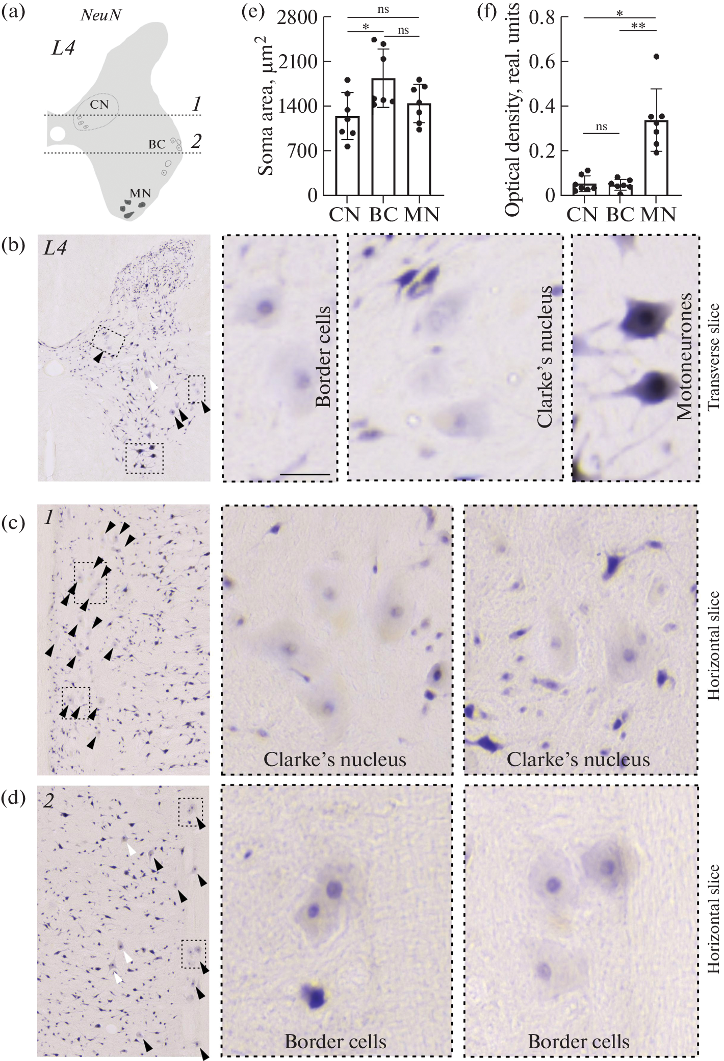 We analyzed the peculiarities of the NeuN immunostaining of the cat spinal cord neurons located in four structures organizing projections to the cerebellum: the Clarke’s nucleus and border cells – in the L4 segment, the central cervical nucleus – in the C3 segment, and the Stilling’s nucleus – in the S2 segment. Morphometric and densitometric studies were carried out. It was shown that all neurons of interest have a striking feature: an extremely weak level of the cytoplasmic NeuN-staining, while maintaining a high level of the nuclear NeuN-staining. The soma size of neurons of interest was 1000–1850 mkm2, which is comparable to the size of another type of large neurons at slices – motoneurons (1140–1660 mkm2). Thus, we used a motoneuronal population of the corresponding segments to compare the values of optical density. The relative optical density of neurons of interest was several times lower than for the motoneurons (0.060 ± 0.030 vs 0.330 ± 0.127). There were no significant differences in optical density between different structures of interest. Given the morphological uniqueness and similarity of these four cell populations, we believe that the feature of NeuN protein expression can be used as a simple tool for the visualization of cells organizing projections to the cerebellum. It can be valuable both for targeted morphological examination and for histological control after a physiological experiment.