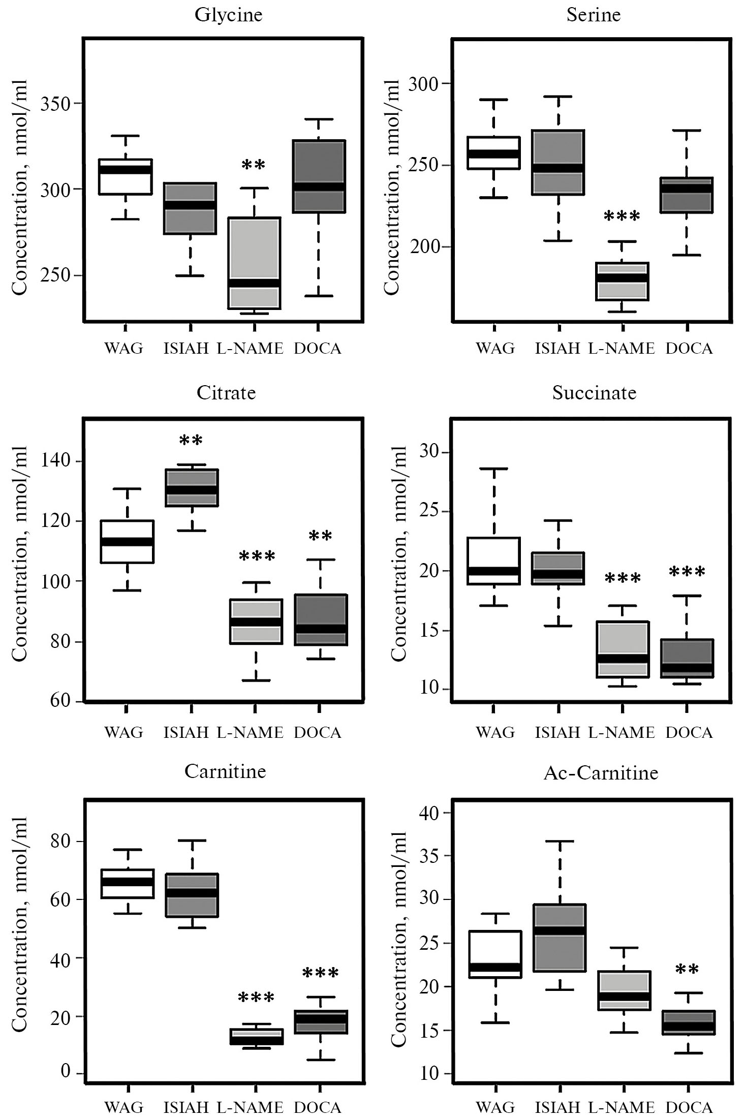 Рис. 2. Межгрупповые различия (ISIAH, L-NAME, DOCA vs WAG) в концентрациях метаболитов, связанных с метаболизмом глицина (глицин, серин), циклом Кребса (цитрат, сукцинат), с окислительным метаболизмом (карнитин, ацетилкарнитин). Критерий Манна–Уитни, * – p < 0.05, ** – p < 0.01, *** – p < 0.001.
