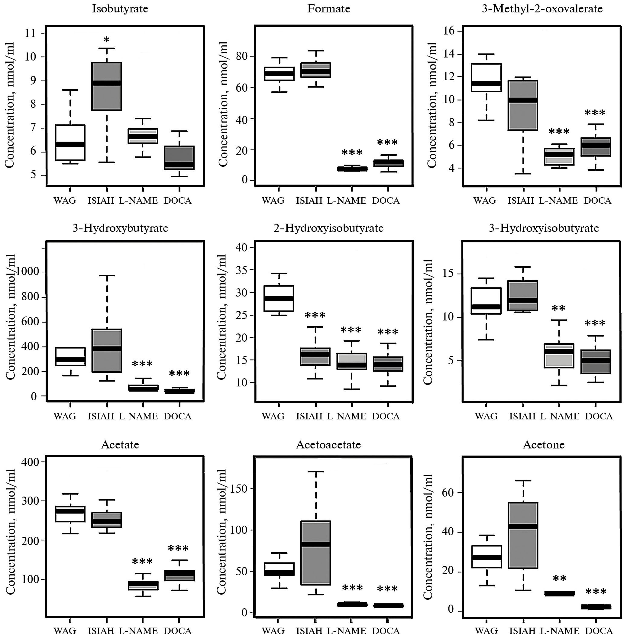 Рис. 3. Межгрупповые различия (ISIAH, L-NAME, DOCA vs WAG) в концентрациях метаболитов, связанных с деятельностью микробиоты кишечника (изобутират, формиат, 3-метил‑2-оксовалерат, 3-гидроксибутират, 2-гидроксиизобутират, 3-гидроксиизобутират, ацетат, ацетоацетат, ацетон). Критерий Манна–Уитни, * – p < 0.05, ** – p < 0.01, *** – p < 0.001.