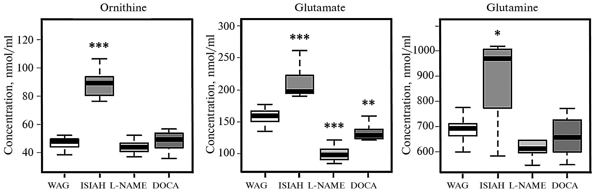 Рис. 4. Межгрупповые различия (ISIAH, L-NAME, DOCA vs WAG) в концентрациях метаболитов, связанных с циклом мочевины и оксида азота (орнитин), а также глутамата и глутамина. Критерий Манна–Уитни, * – p < 0.05, ** – p < 0.01, *** – p < 0.001.