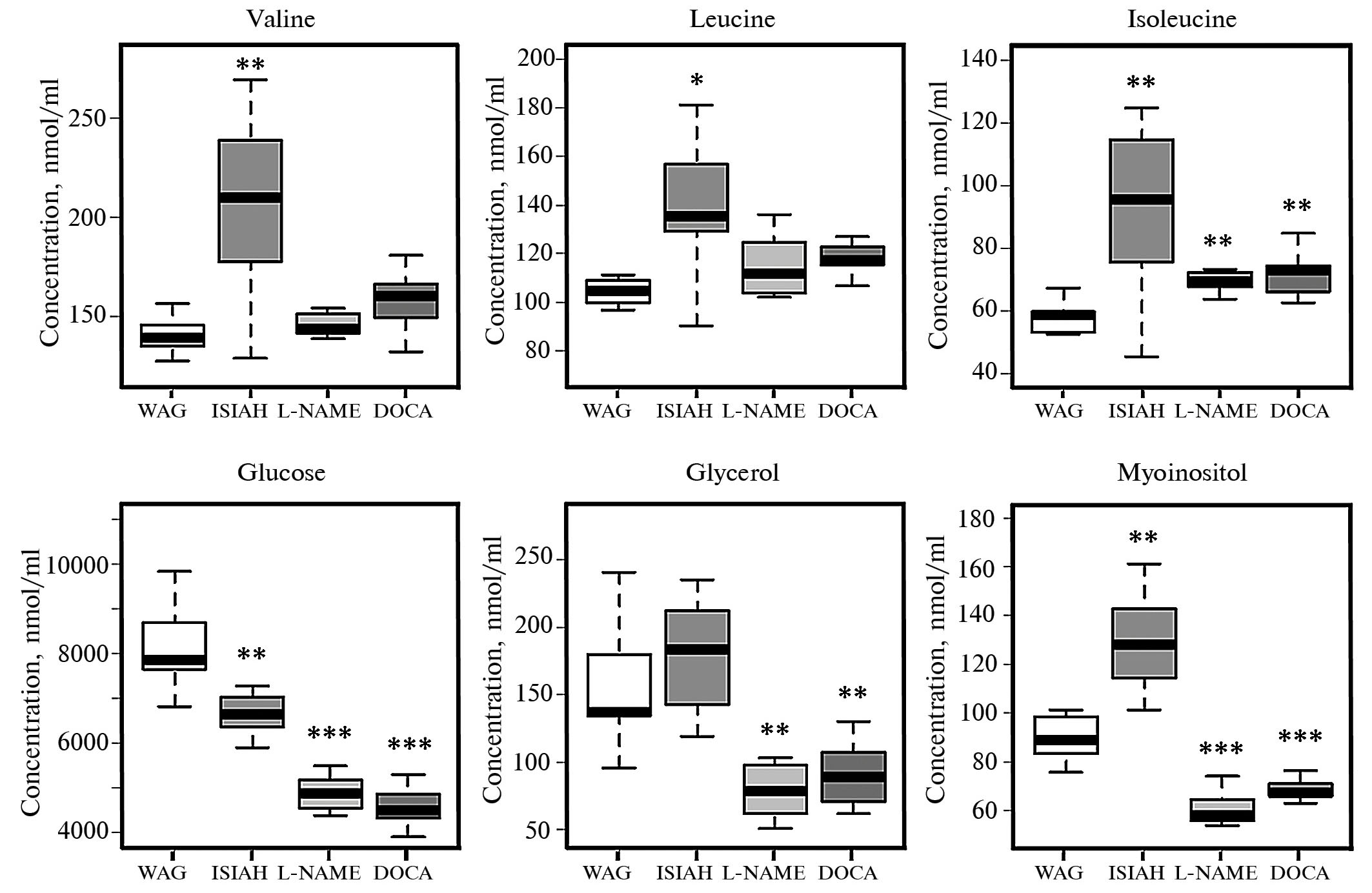 Рис. 5. Межгрупповые различия (ISIAH, L-NAME, DOCA vs WAG) в концентрациях метаболитов, связанных с метаболизмом глюкозы (валин, лейцин, изолейцин, глюкоза, глицерол, мио-инозитол). Критерий Манна–Уитни, * – p < 0.05, ** – p < 0.01, *** – p < 0.001.