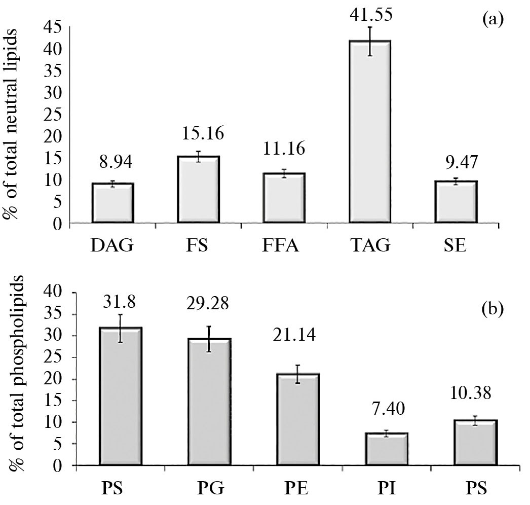 Рис. 1. Содержание фракций нейтральных липидов (а) и фосфолипидов (b) в липидном экстракте зеленой водоросли Codium fragile. DAG – диацилгицерины, FS – свободные стерины, FFA – свободные жирные кислоты, TAG – триацилглицерины, SE – эфиры стеринов, PC – фосфатидилхолин, PG – фосфатидилглицерин, PE – фосфатидилэтаноламин, PI – фосфатидилинозит, PS – фосфатидилсерин.