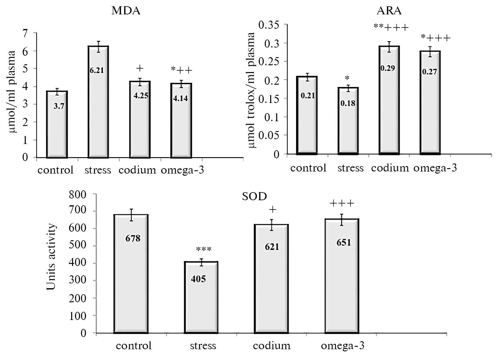 Рис. 2. Влияние липидного экстракта кодиума и Омега‑3 на показатели антиоксидантной системы плазмы крови мышей при стрессе. MDA – малоновый диальдегид, ARA – антирадикальная активность, SOD – супероксиддисмутаза. Изменения статистически достоверны: * р < 0.05, ** р < 0.01, *** р < 0.001 – при сравнении с контролем; + – р < 0.05, ++ – р < 0.01, +++ – р < 0.001 – со 2-й группой (стресс).