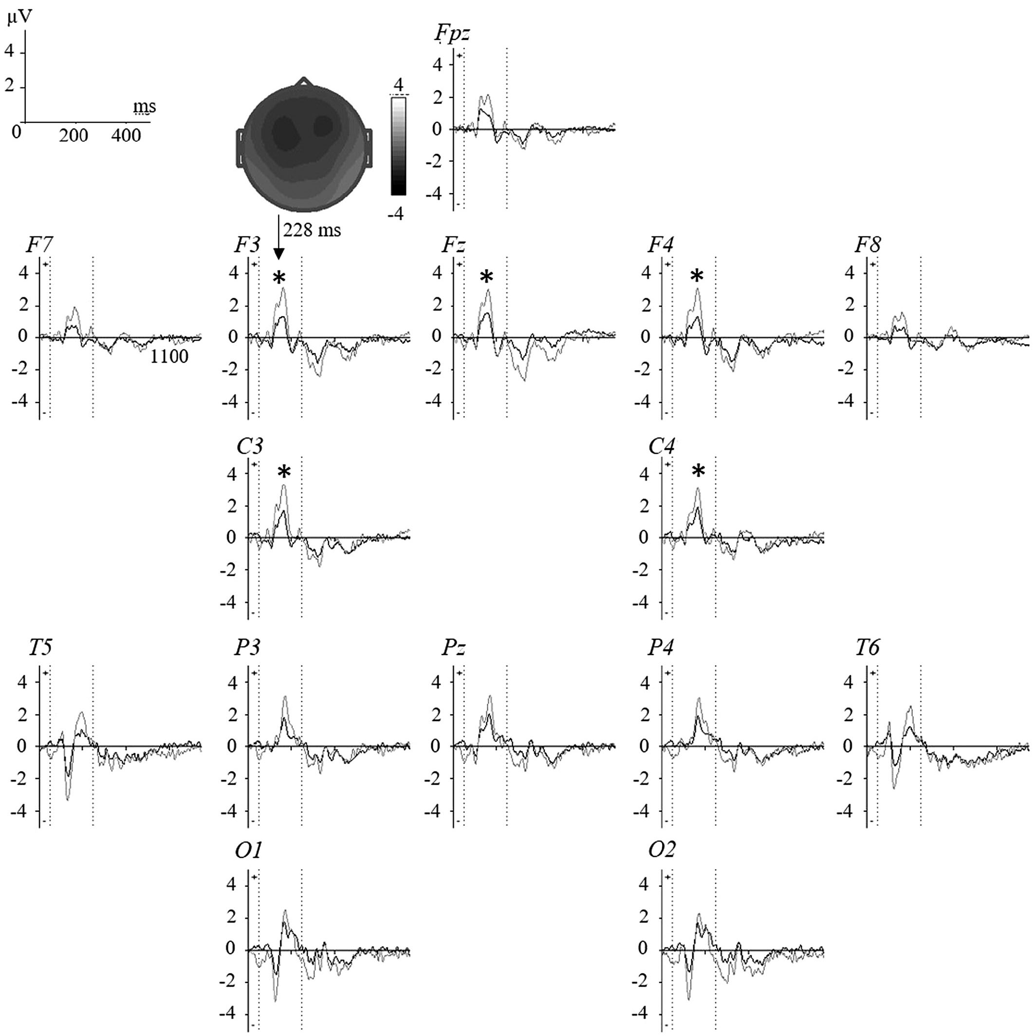 Рис. 2. Вызванные потенциалы при выполнении нетворческого задания в условиях сотрудничества в паре (черная линия) и индивидуально (серая линия). Обозначения: Fpz-O2 – расположение электродов. Для каждого электрода по оси x – время после предъявления первого стимула (мс); по оси y – амплитуда ВП (мкВ). Вертикальные пунктирные линии обозначают начало и конец предъявления стимула (длительность стимула 400 мс). Положительная полярность (плюс) – вверху. Звездочками отмечены электроды и компоненты ВП, амплитуда которых значимо различалась между условиями. Топограмма представляет распределение амплитуд в обозначенный момент времени внутри интервалов различий.