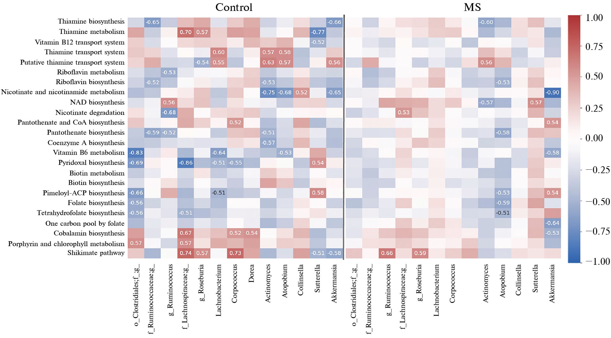 Для выявления возможной связи исследуемых реконструированных метаболических путей витаминов группы В с представленностью бактериальных таксонов был проведен корреляционный анализ, который показал наличие значимых корреляций с филумами Bacteroidota, Firmicutes, Verrucomicrobiota, Proteobacteria и Actinobacteria. Однако выявленные корреляции различались в контрольной группе и группах пациентов с РС (рис. 7).