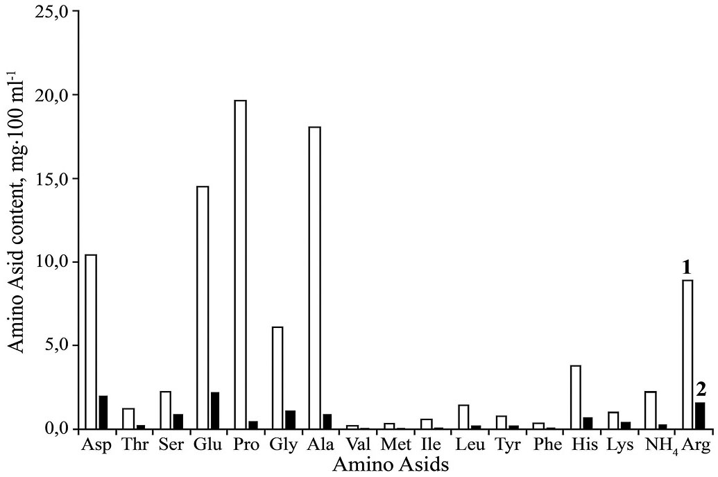 Рис. 1. Содержание свободных аминокислот в гемолимфе анадары Anadara kagoshimensis при нормоксии (1) и гипоксии (2). Примечание. Глутамин и аспарагин в процессе разделения в кислой среде разлагаются на глутаминовую и аспарагиновую кислоты, поэтому на хроматограмме появляется пик аммиака (см. рис. 1, 2, 3).